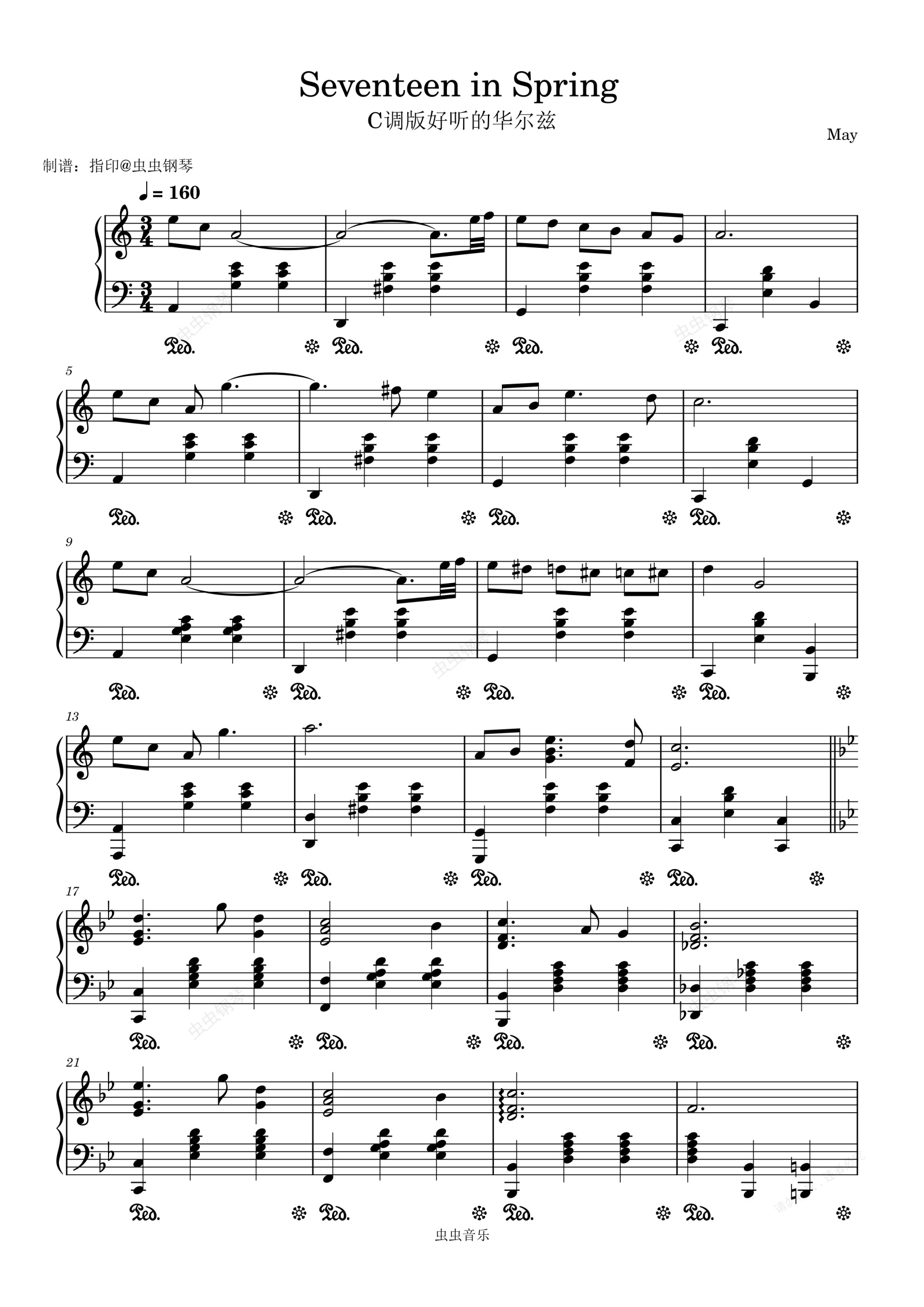 钢琴谱:C调版好听的华尔兹《Seventeen in Spring》