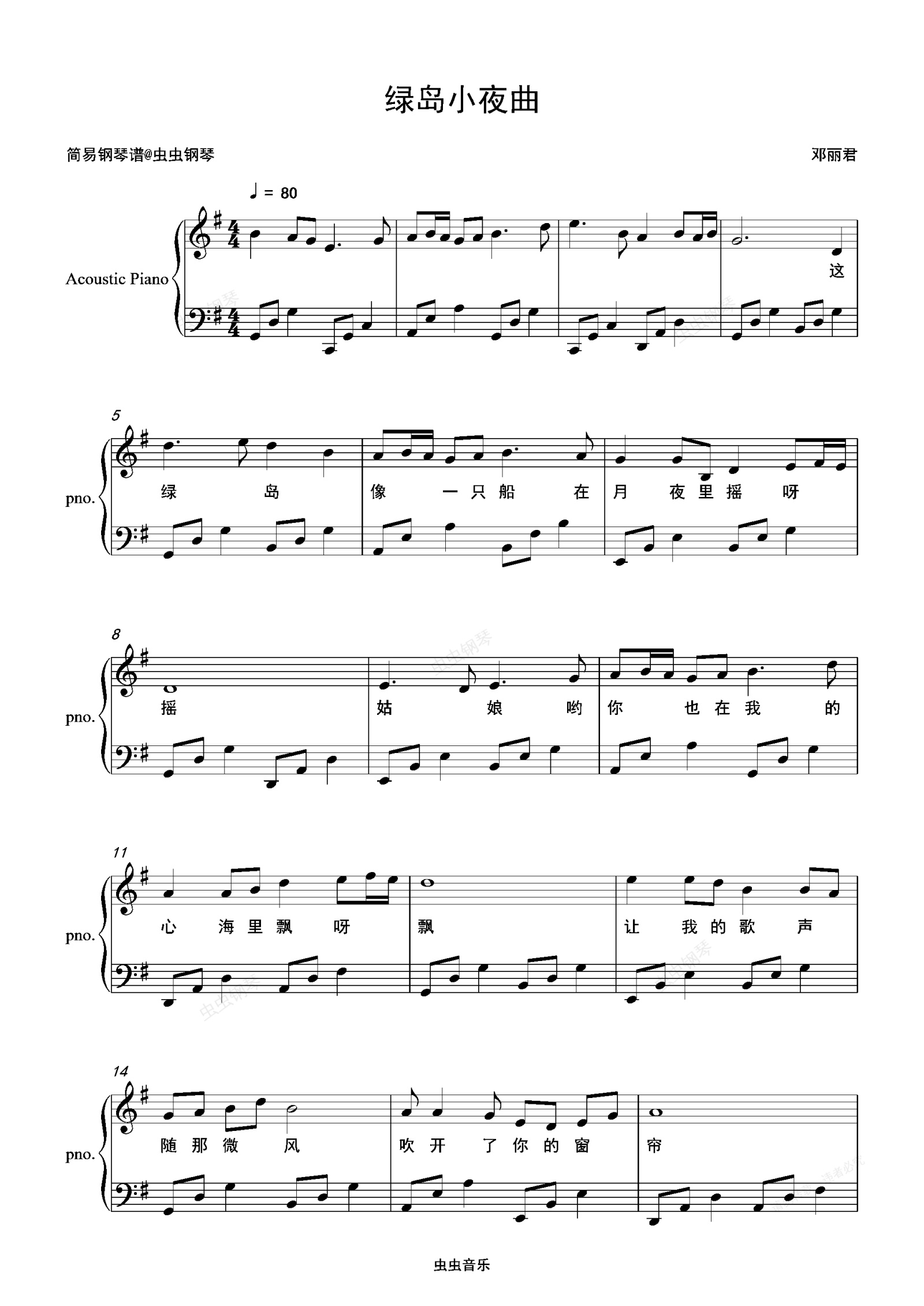 钢琴谱:绿岛小夜曲-邓丽君 G调独奏