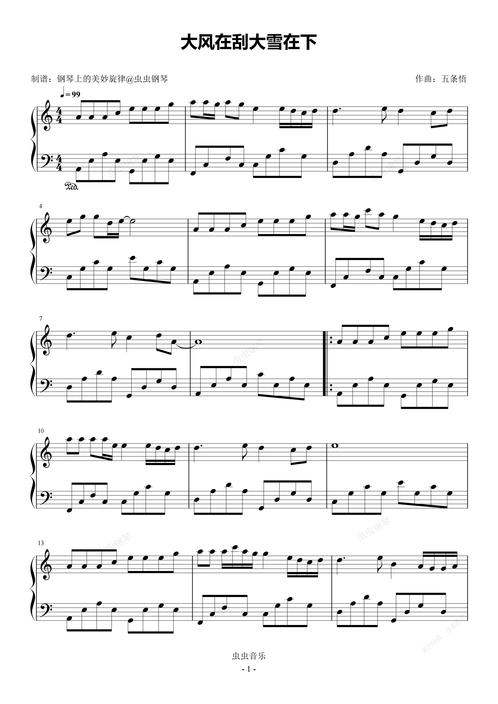 钢琴谱:大风在刮大雪在下 C调简易版 六小乐