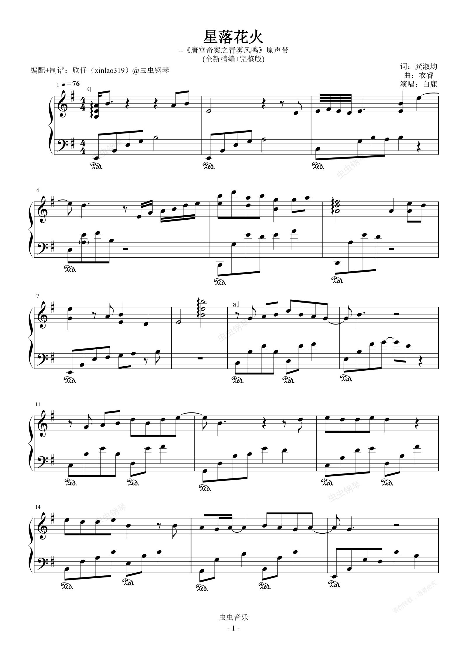 钢琴谱:星落花火(e、白鹿《唐宫奇案之青雾风鸣》原声带、完整版)