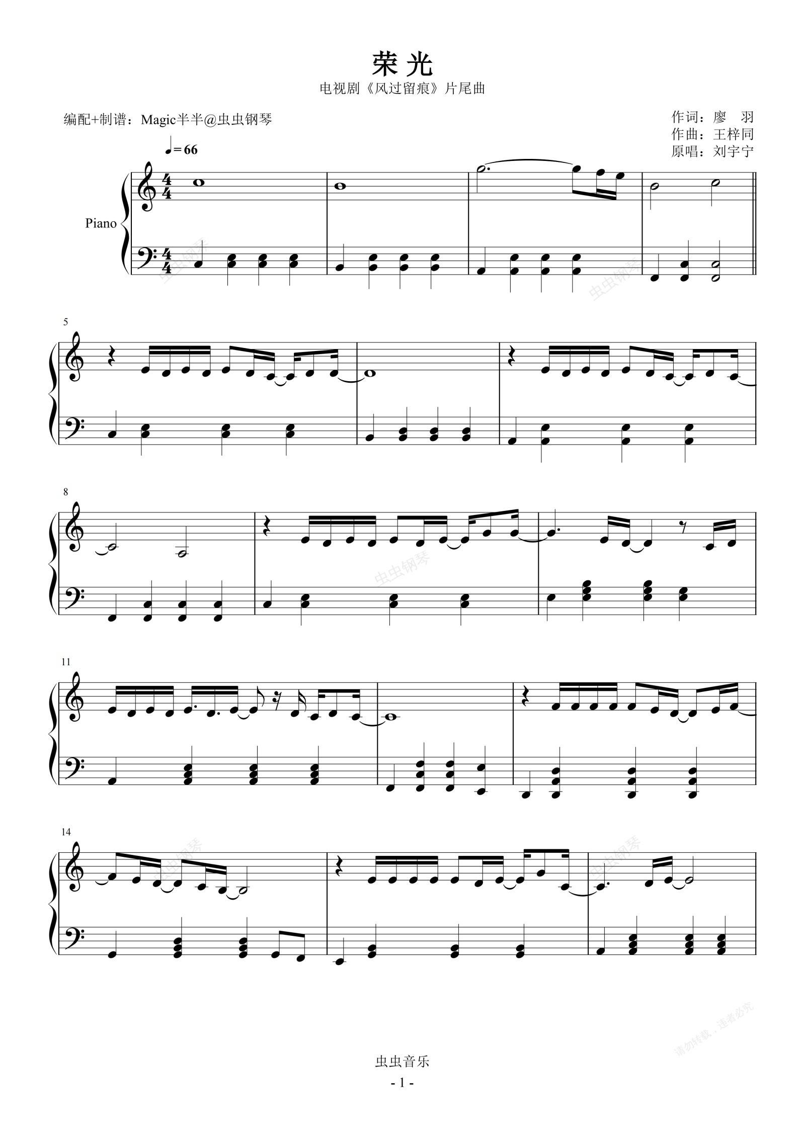 钢琴谱:荣光(实用精华版/C) <风过留痕>电视剧片尾曲