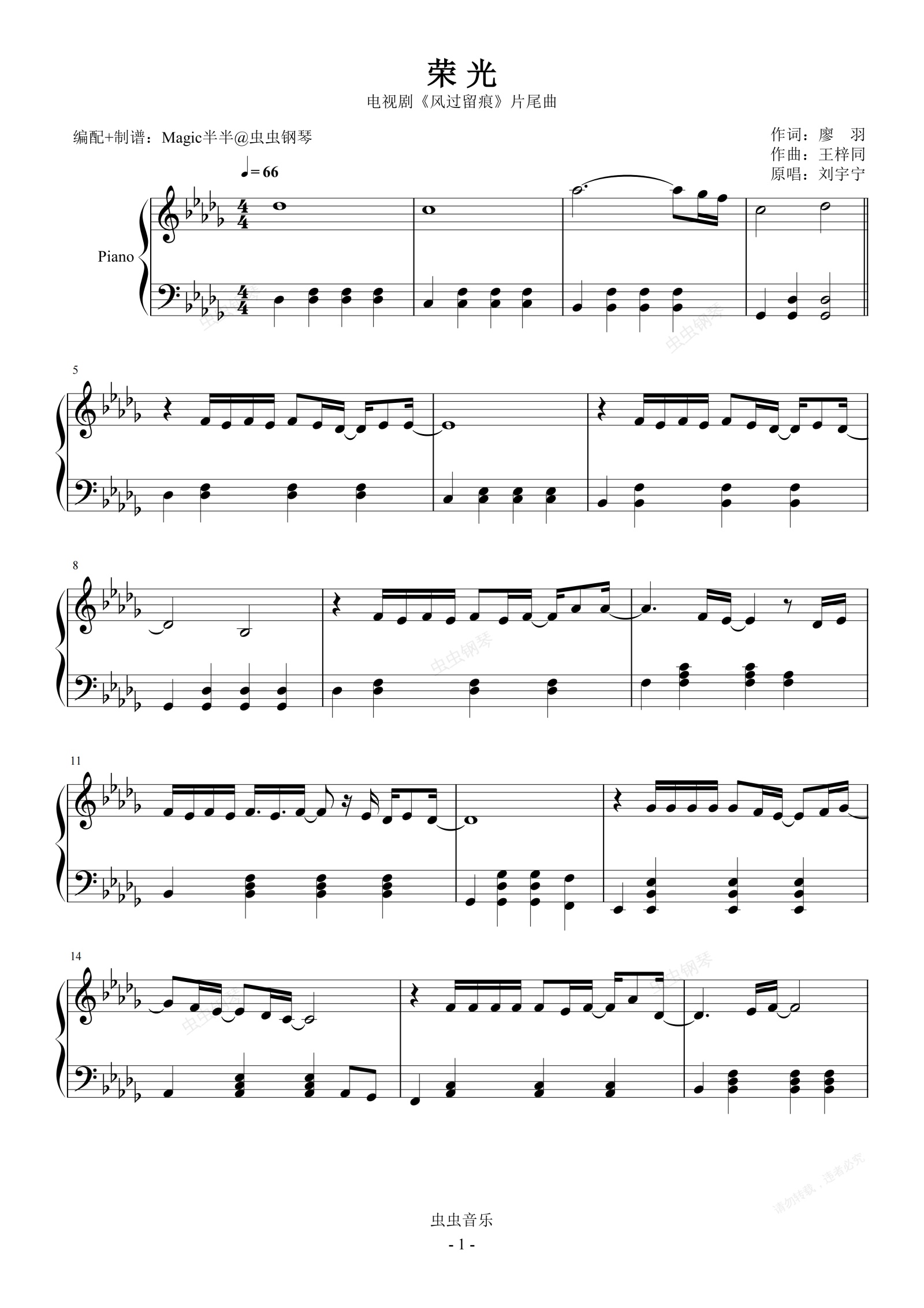钢琴谱:荣光(实用精华版/降D) <风过留痕>电视剧片尾曲