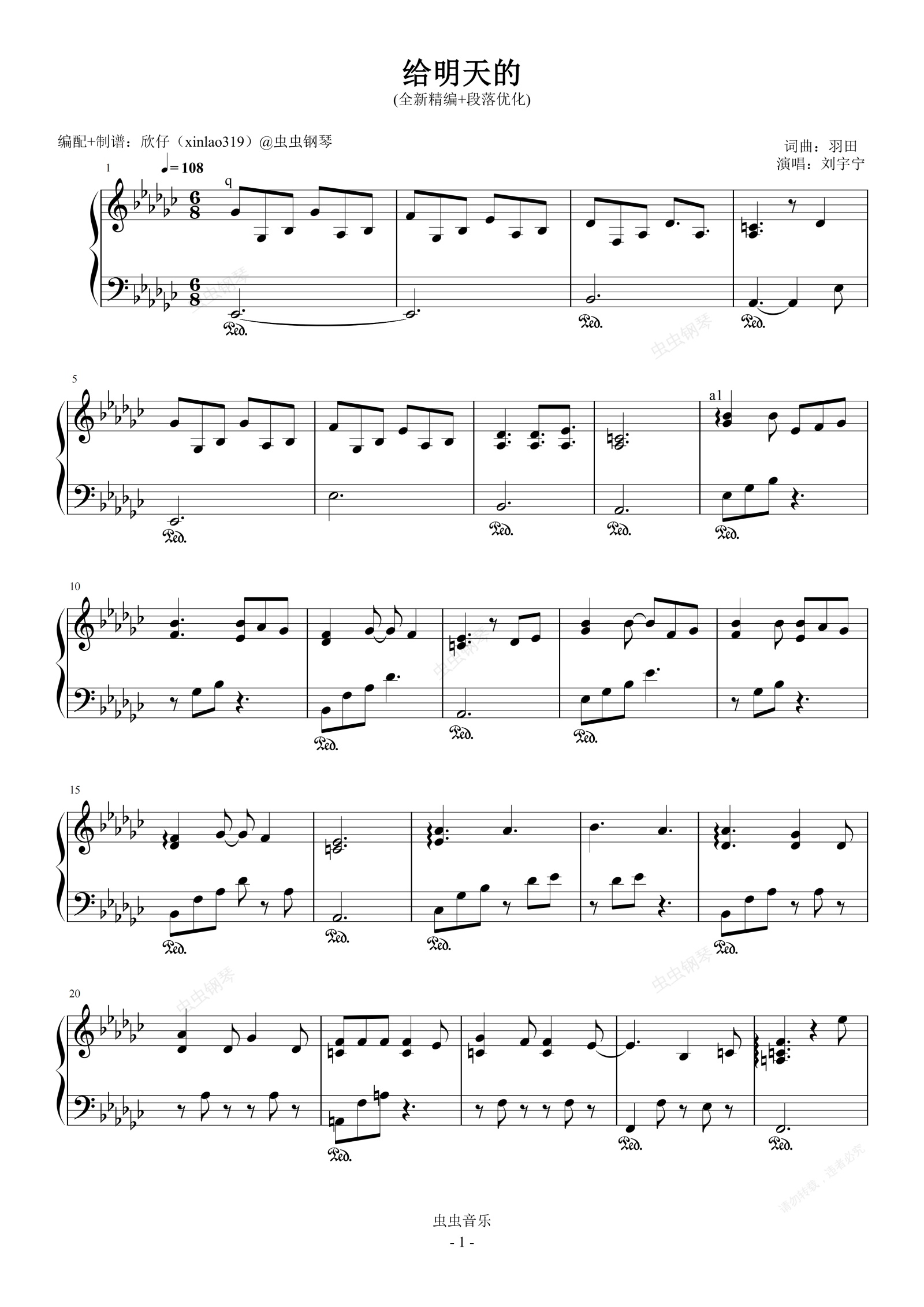 钢琴谱:给明天的(原调降G、刘宇宁、全新精编+段落优化)