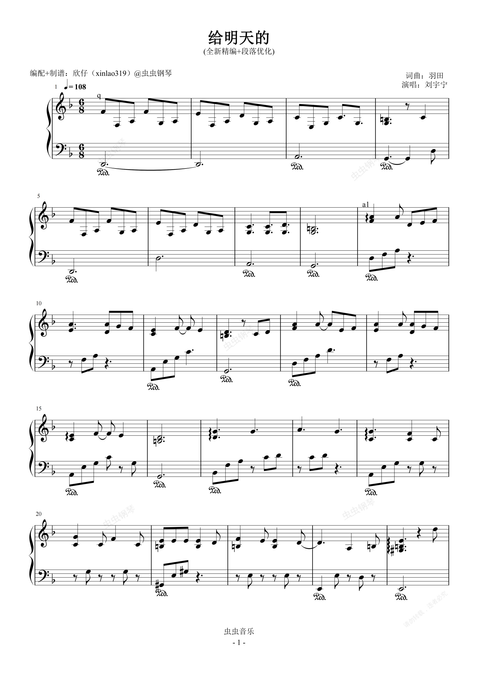 钢琴谱:给明天的(F、刘宇宁、全新精编+段落优化)