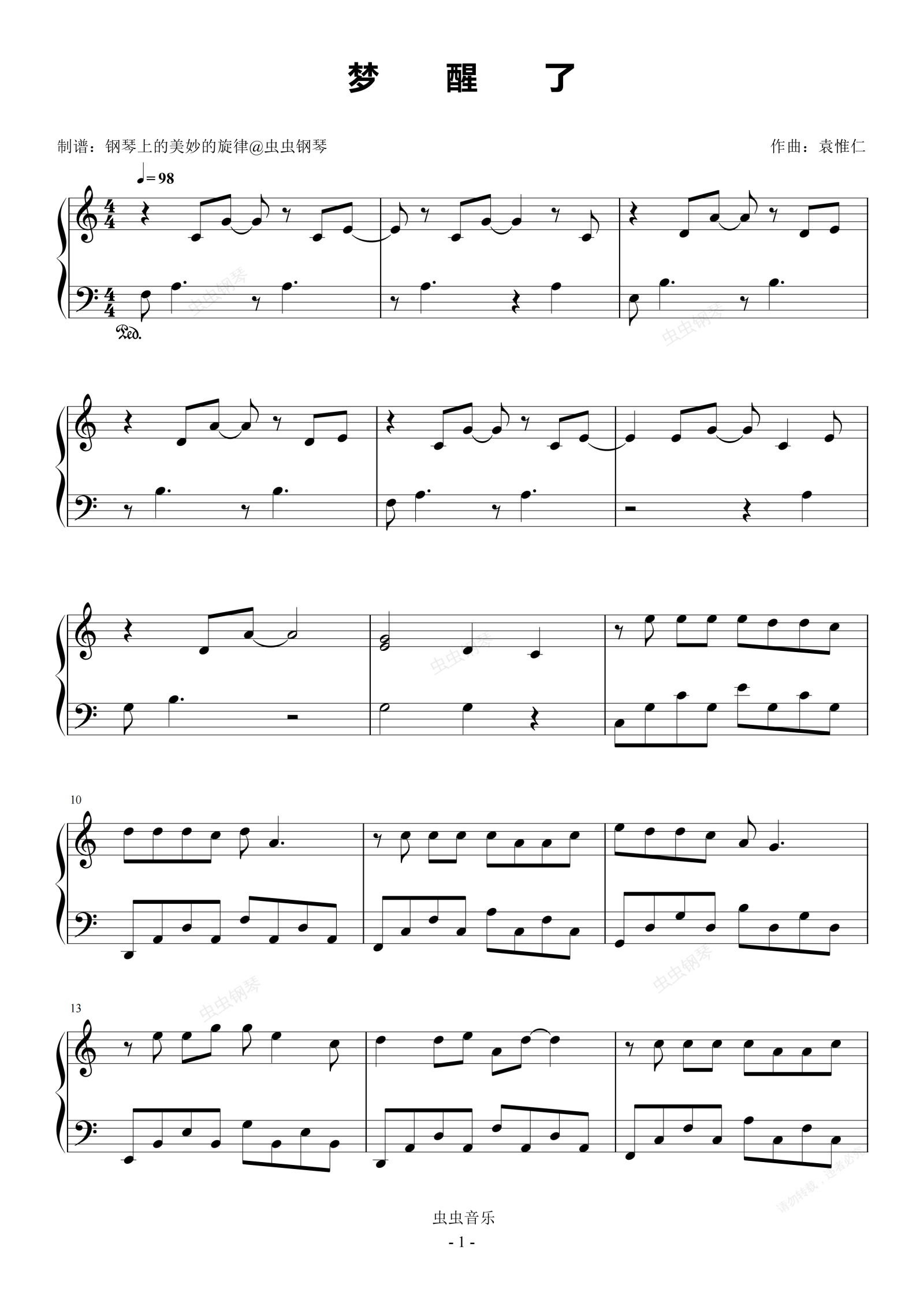 钢琴谱:梦醒了 C调简易版 袁惟仁