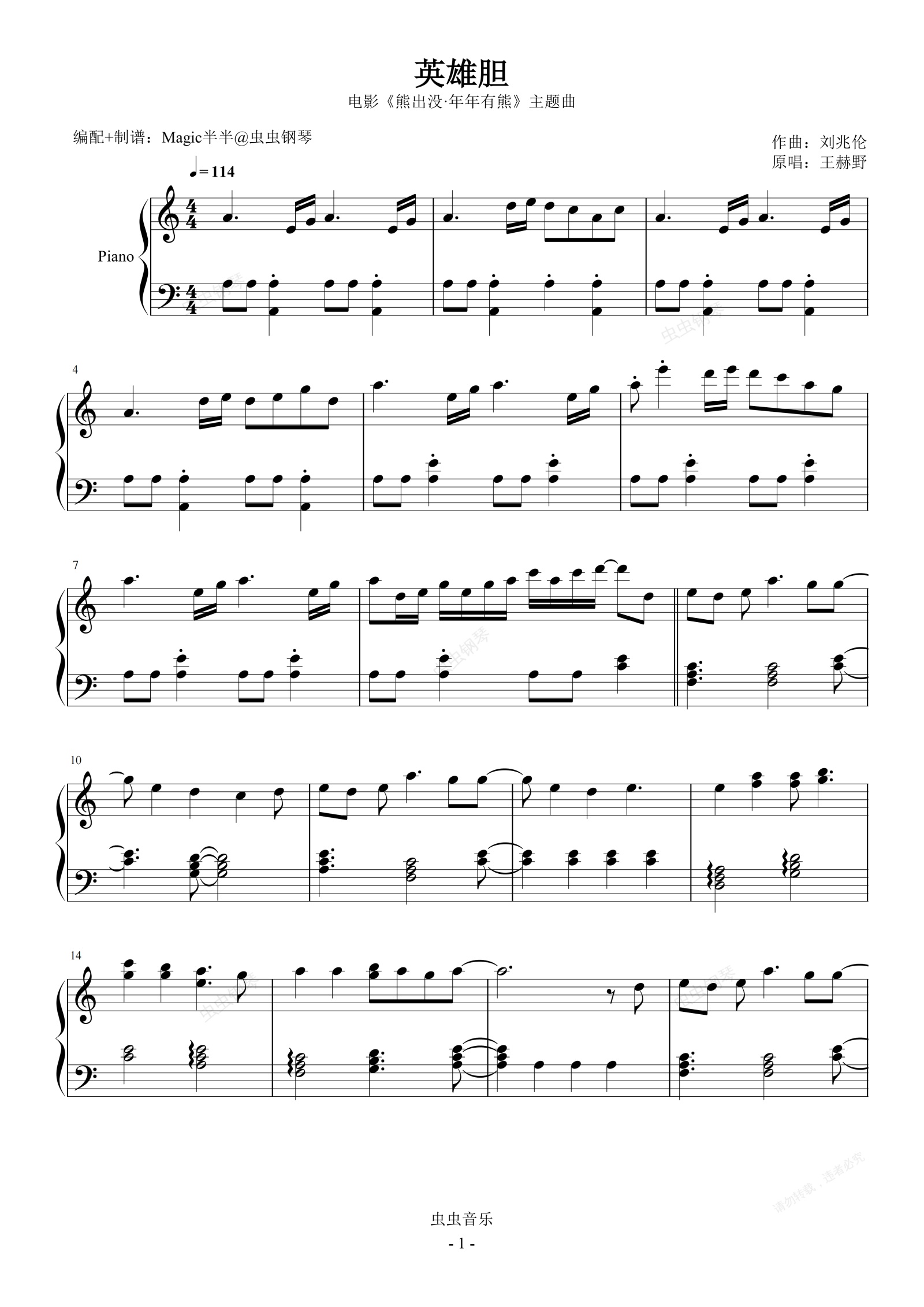 钢琴谱:英雄胆(实用完整版/独奏C) <熊出没·年年有熊>电影主题曲