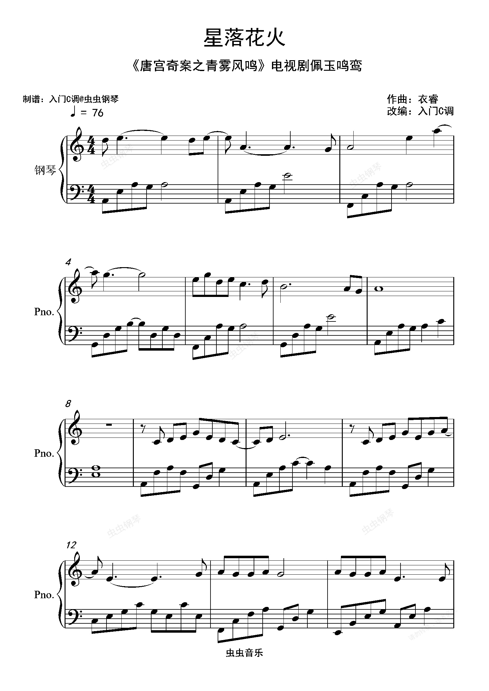 钢琴谱:星落花火 (《唐宫奇案之青雾风鸣》电视剧佩玉鸣鸾)-白鹿【入门C调简单版】