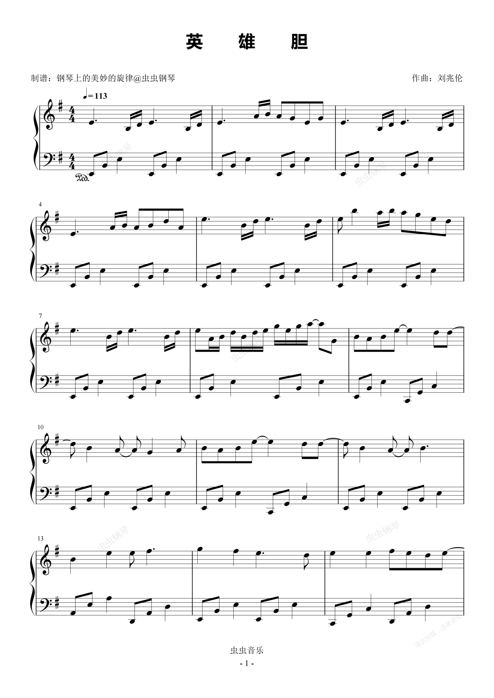 钢琴谱:英雄胆 原调简易版 王赫野 熊出没·年年有熊