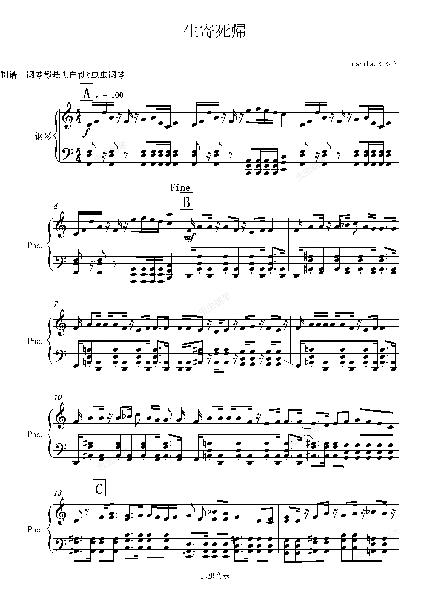 钢琴谱:【初音ミク&鏡音リン】生寄死帰