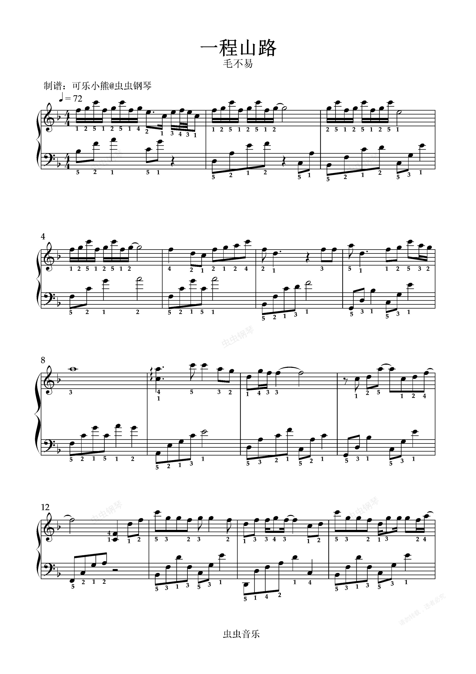 钢琴谱:毛不易《一程山路》F调+指法