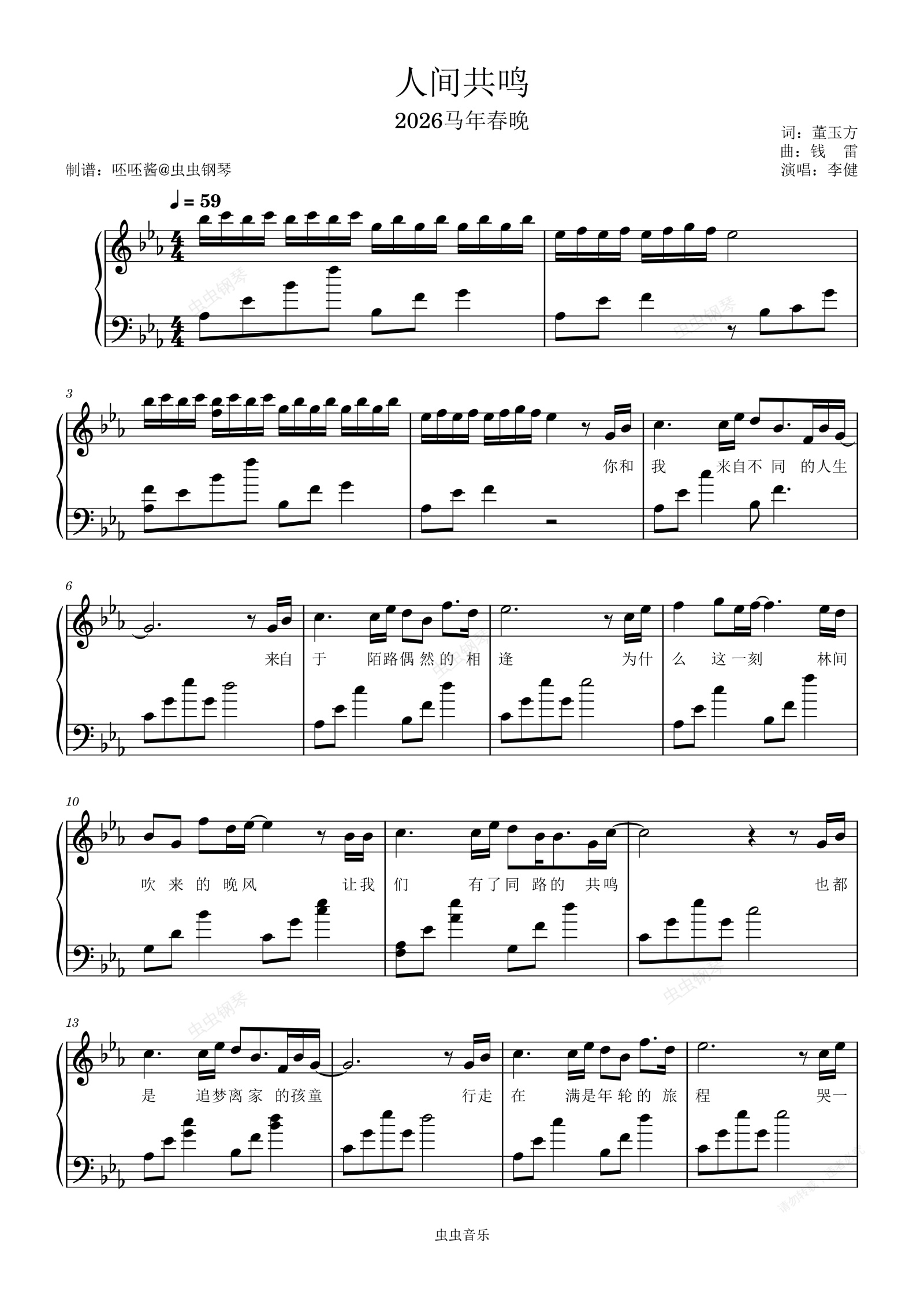 钢琴谱:人间共鸣【女生版】-李健-Eb调