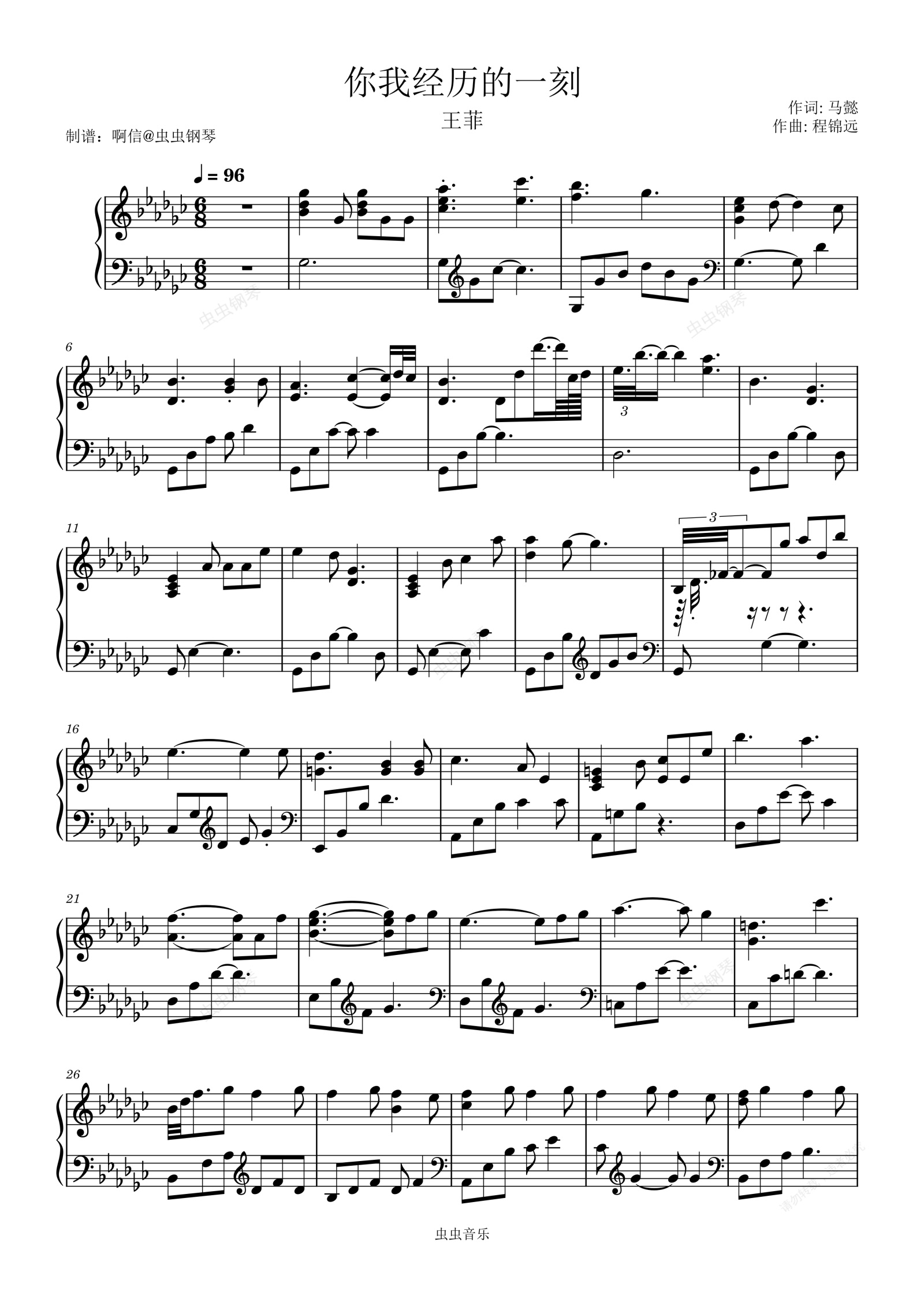 钢琴谱:王菲-你我经历的一刻【2026年春晚】F#调
