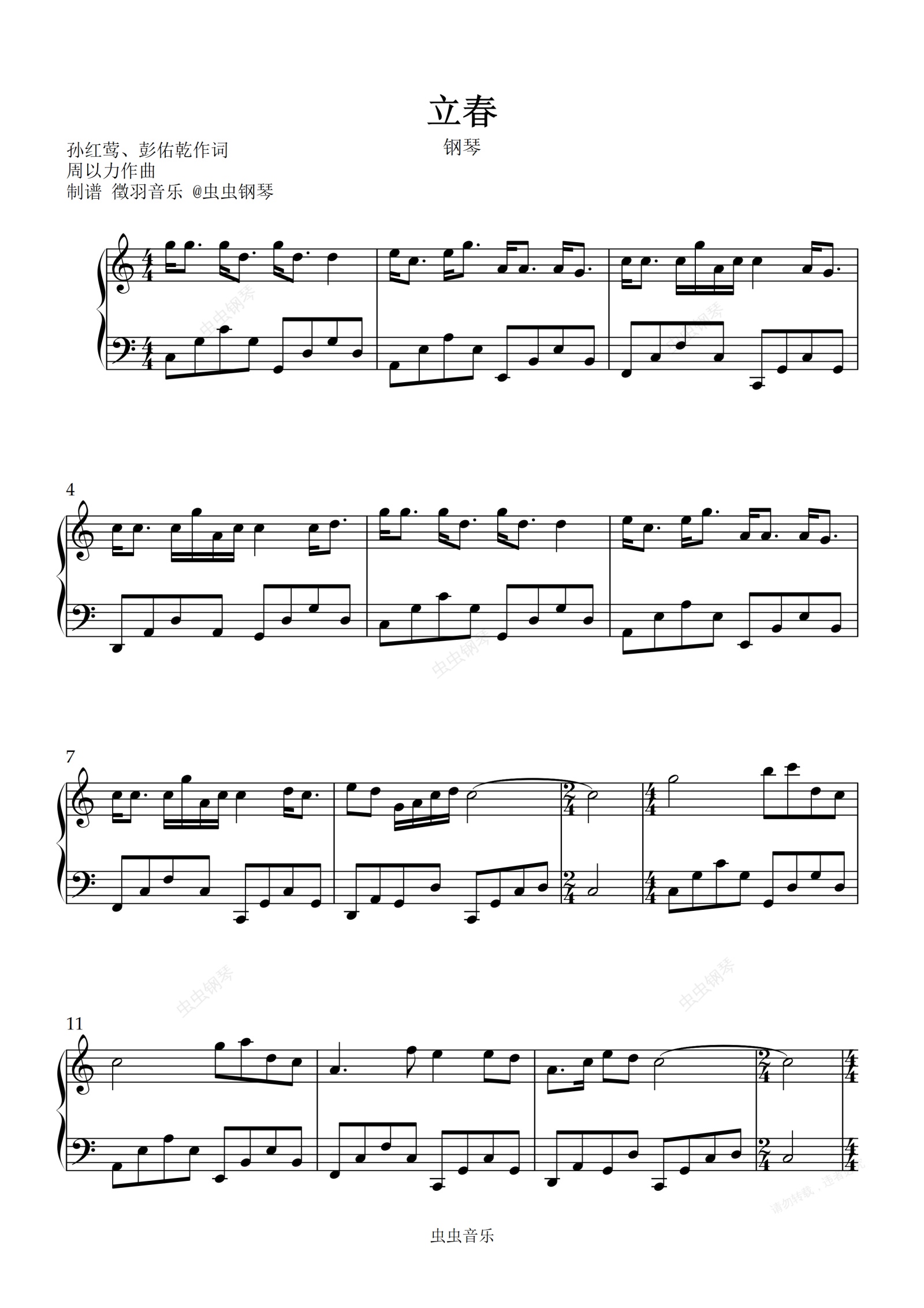 钢琴谱:立春 2016年春晚歌曲 (C调简单易弹版)