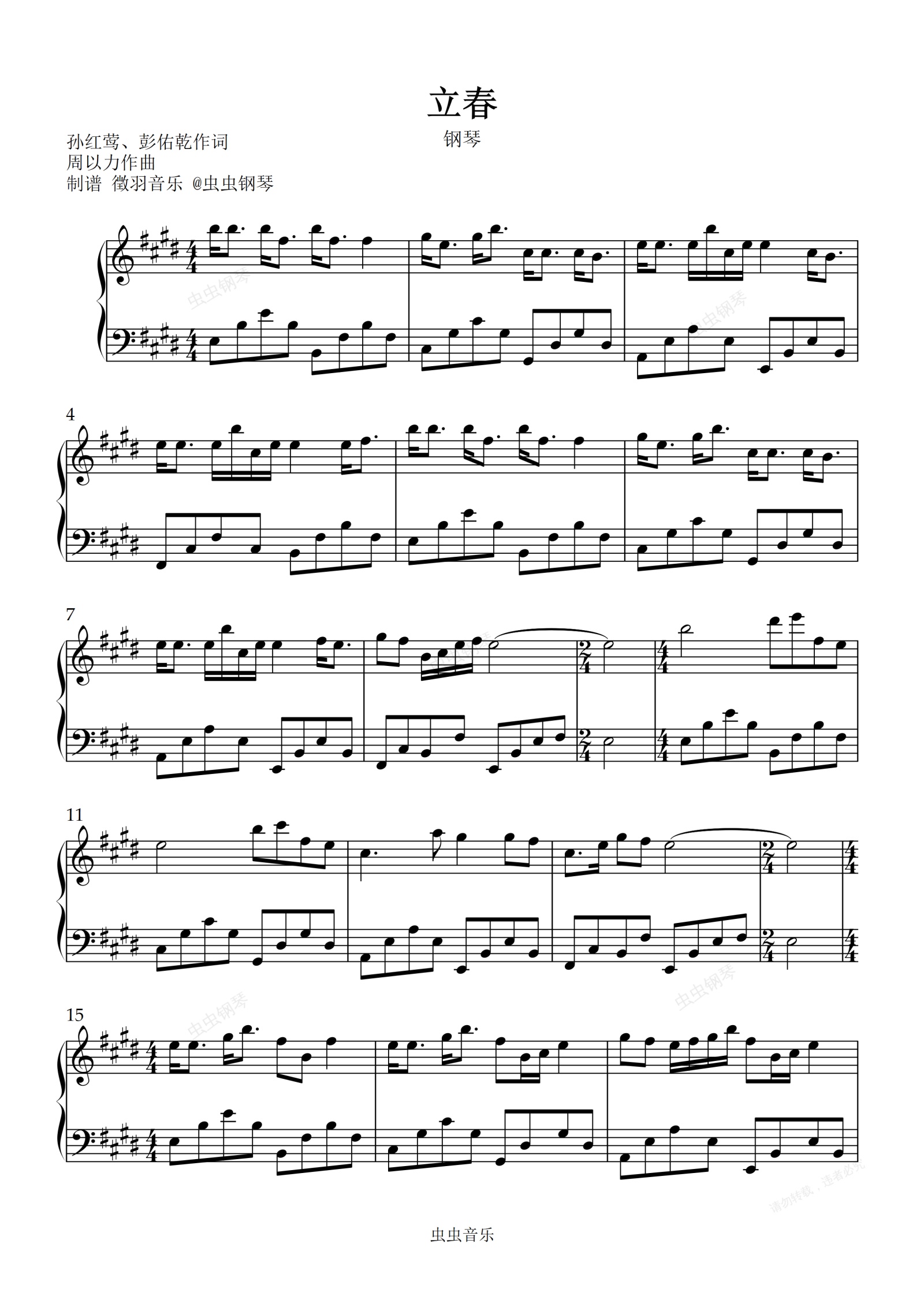 钢琴谱:立春 2016年春晚歌曲 (原调简单易弹版)