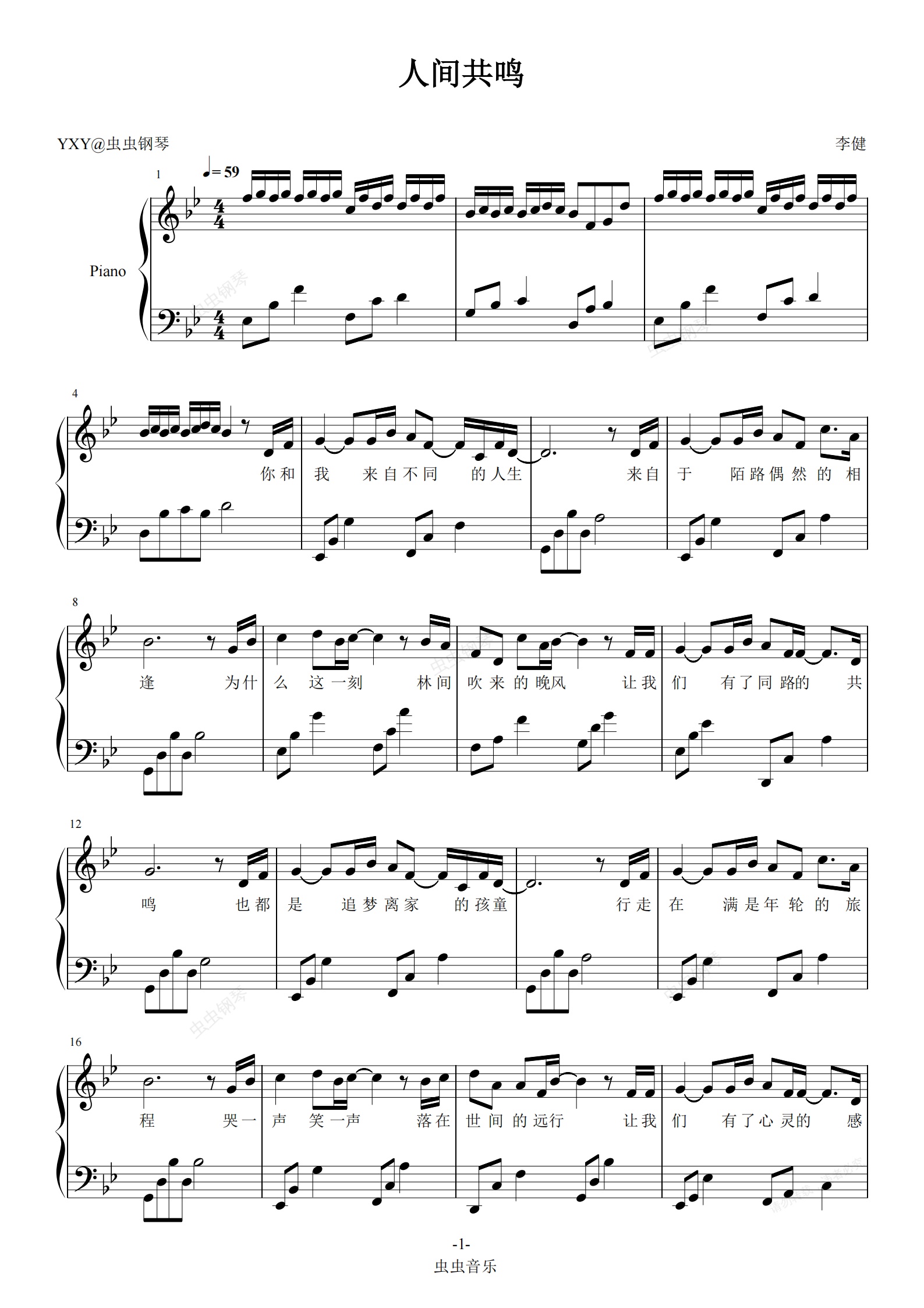 钢琴谱:人间共鸣-钢琴简化版(原调,附歌词)