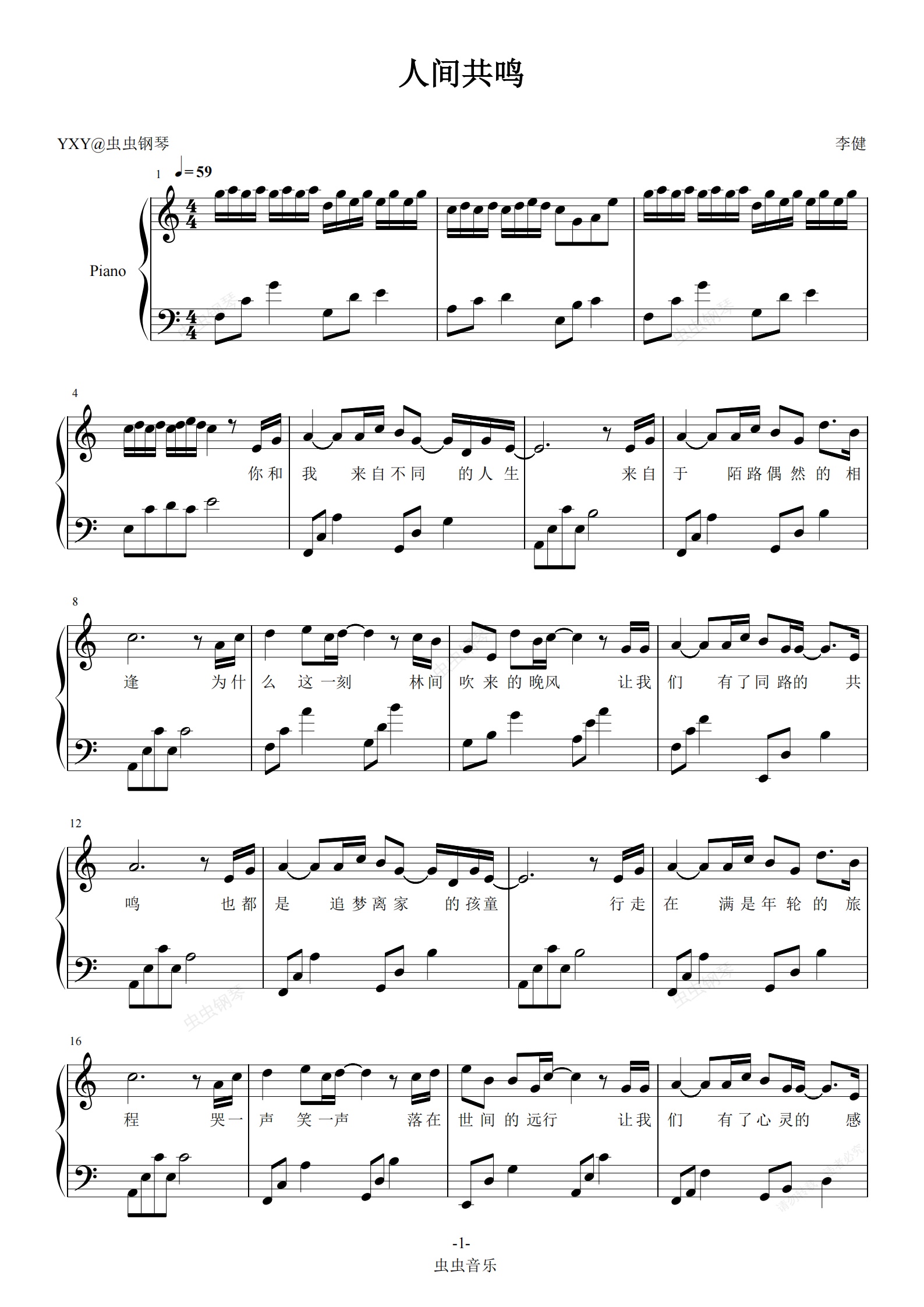钢琴谱:人间共鸣-钢琴简化版(C调无改调,附歌词)