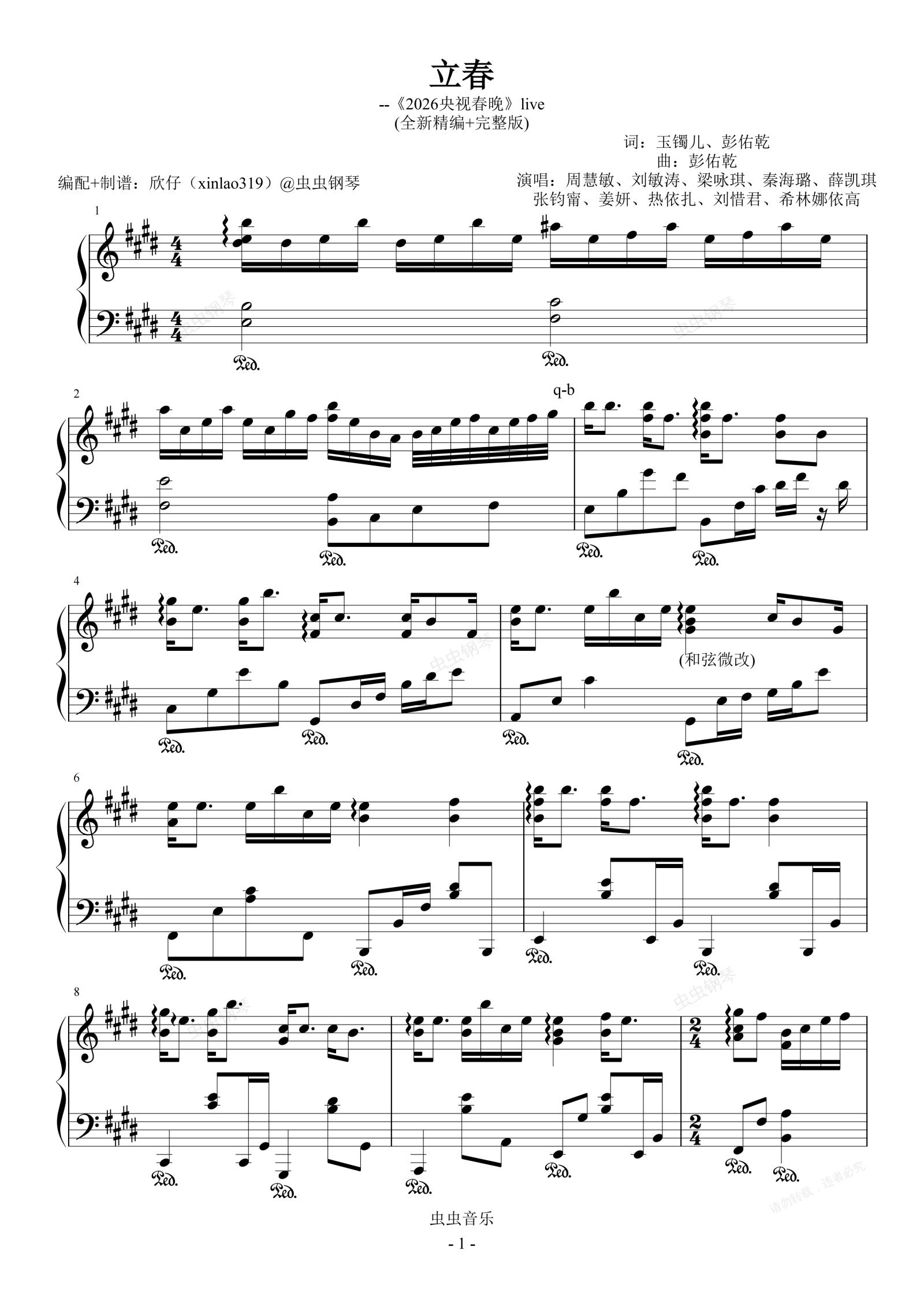 钢琴谱:立春(原调E《2026央视春晚》live)、完整版