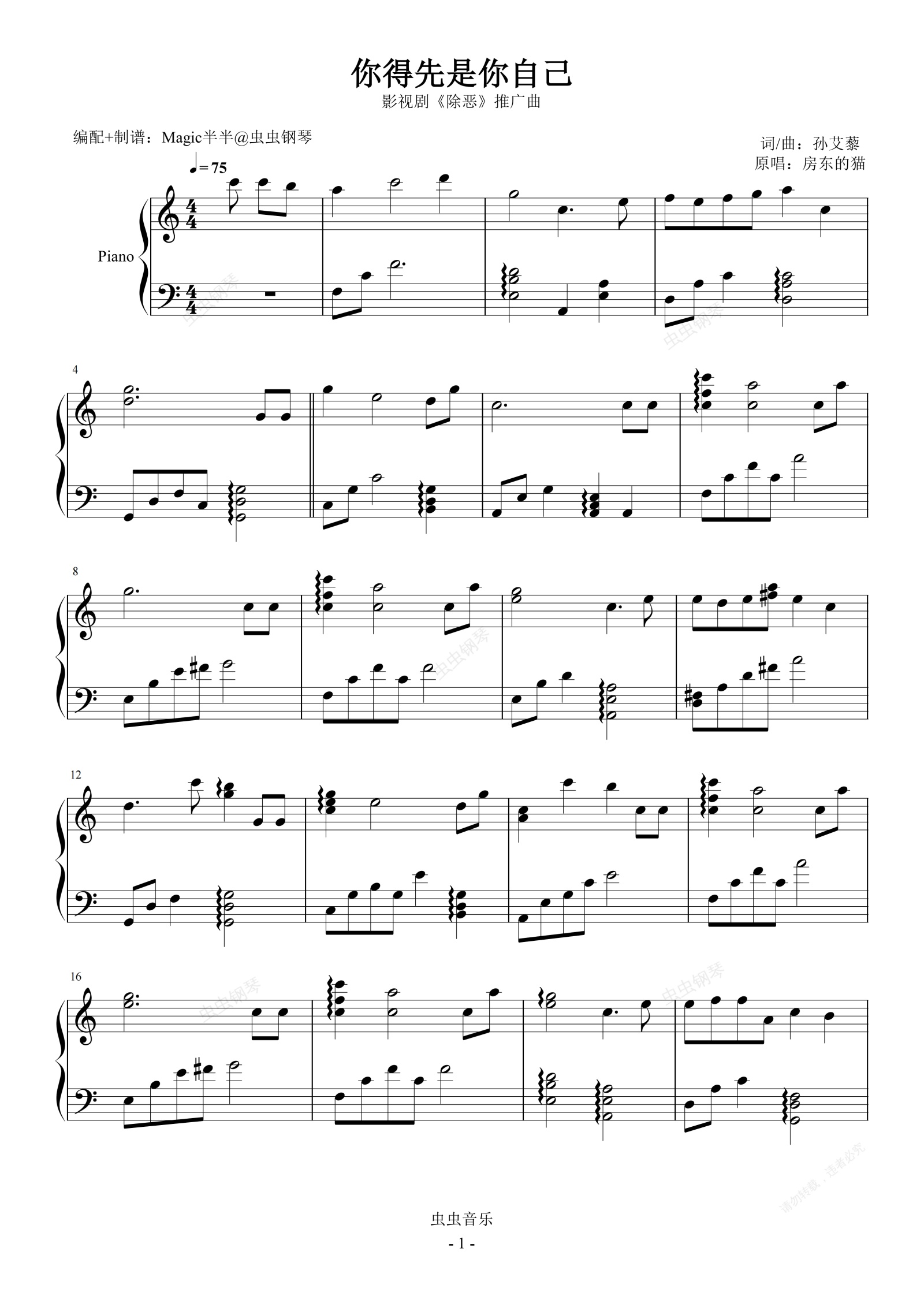 钢琴谱:你得先是你自己(实用完整版/治愈独奏/C调) <除恶>影视剧推广曲