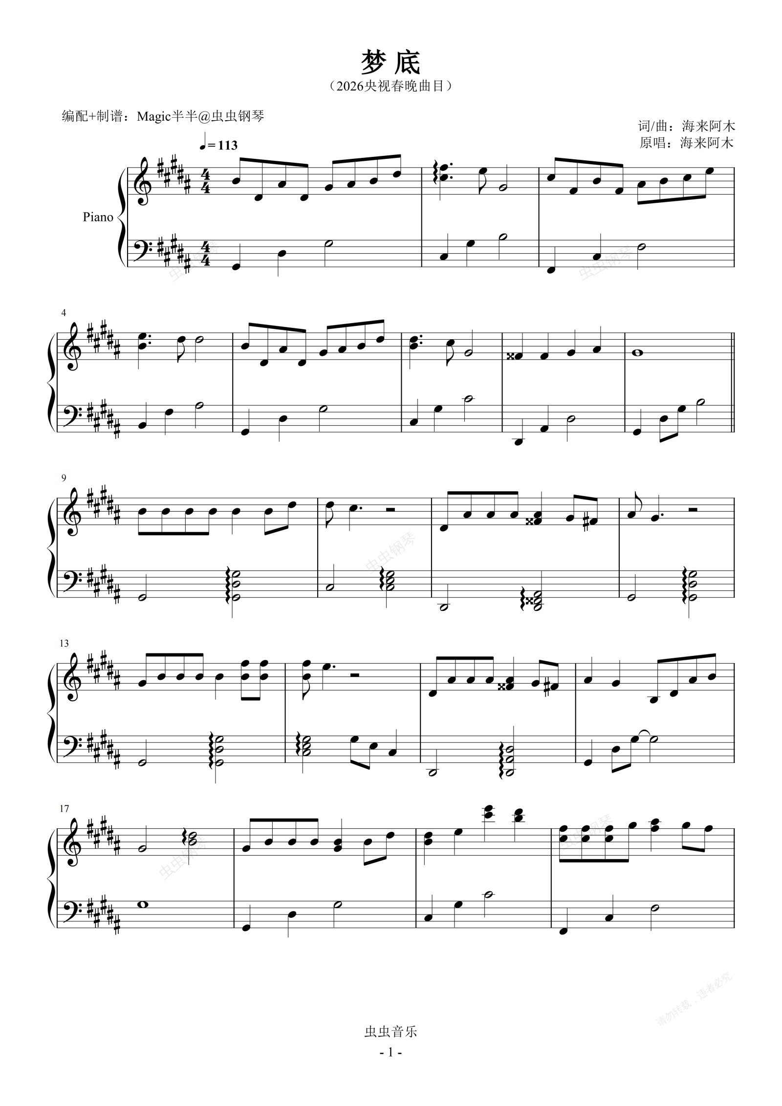 钢琴谱:梦底(实用完整版/独奏B) <2026央视春晚>海来阿木