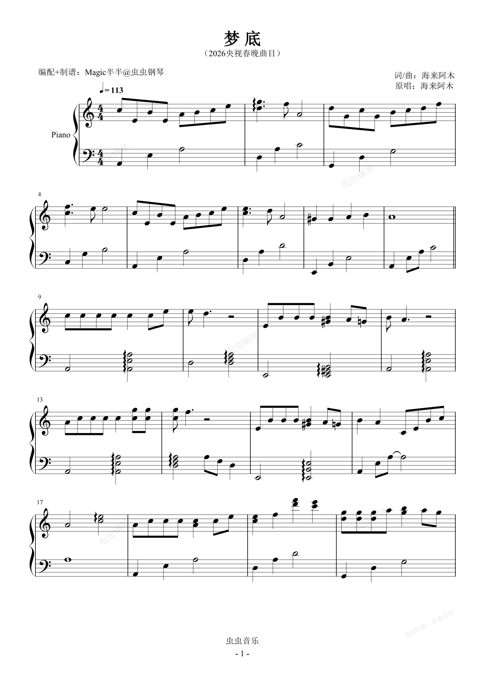 钢琴谱:梦底(实用完整版/独奏C) <2026央视春晚>海来阿木