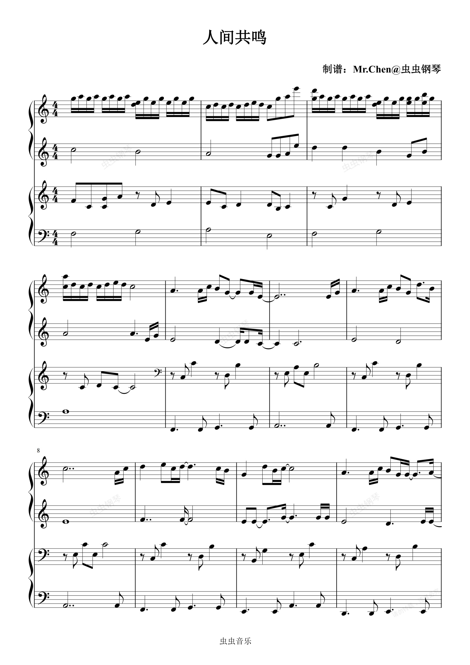 钢琴谱:人间共鸣 (四手联弹)C调 - 2026年春晚 李健