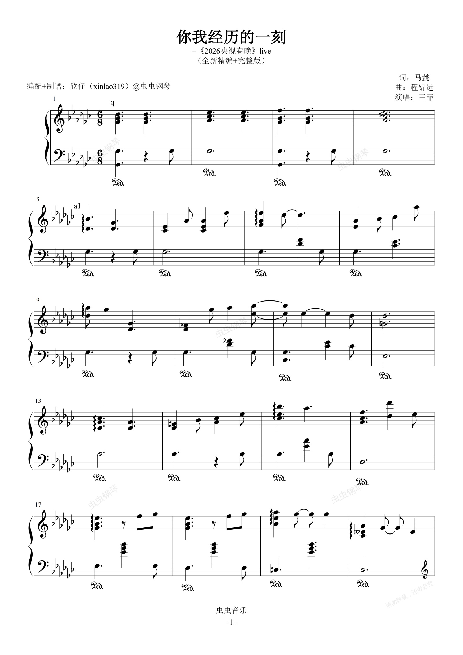 钢琴谱:你我经历的一刻(原调降G、王菲《2026央视春晚》live、完整版)