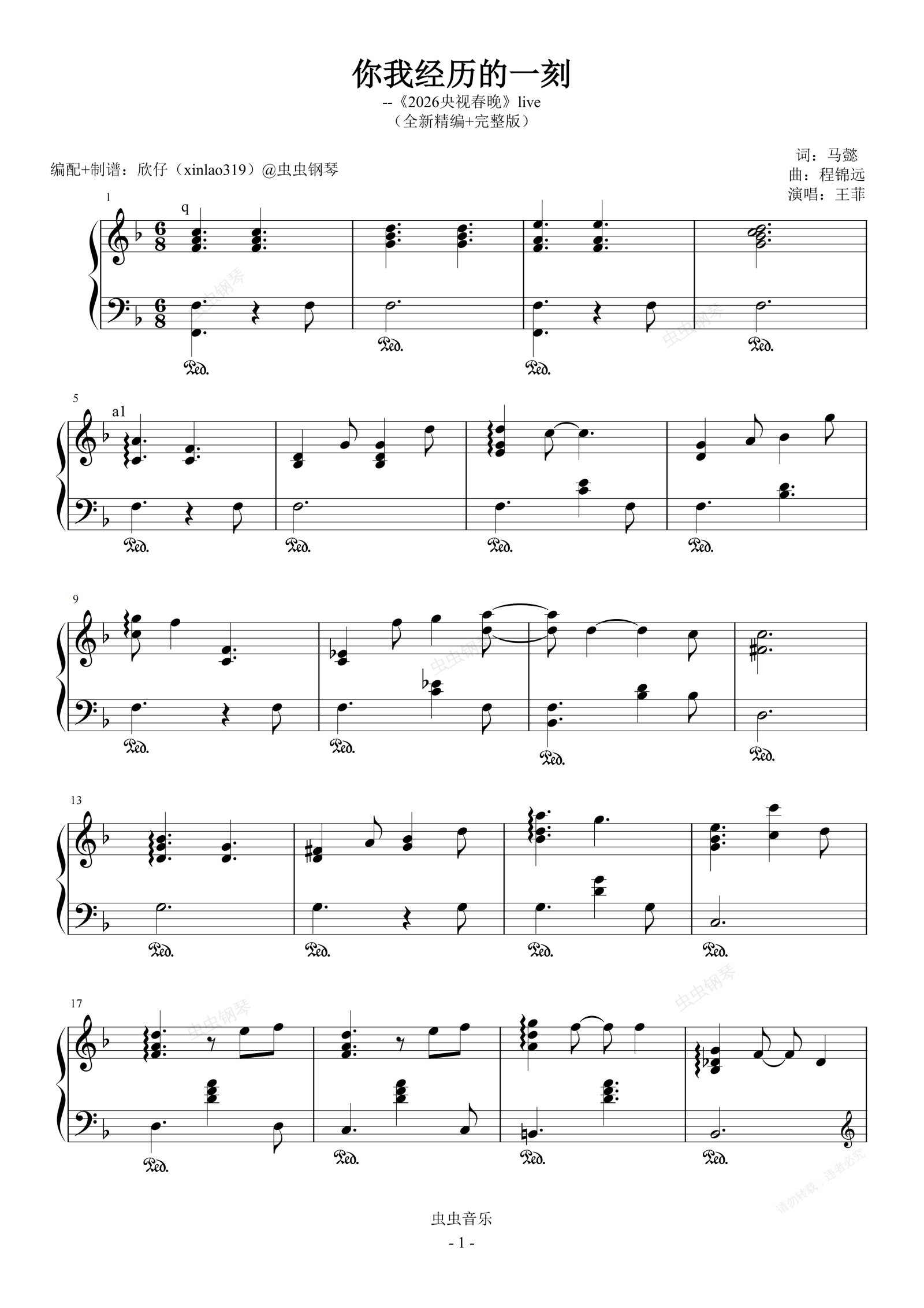 钢琴谱:你我经历的一刻(F、王菲《2026央视春晚》live、完整版)