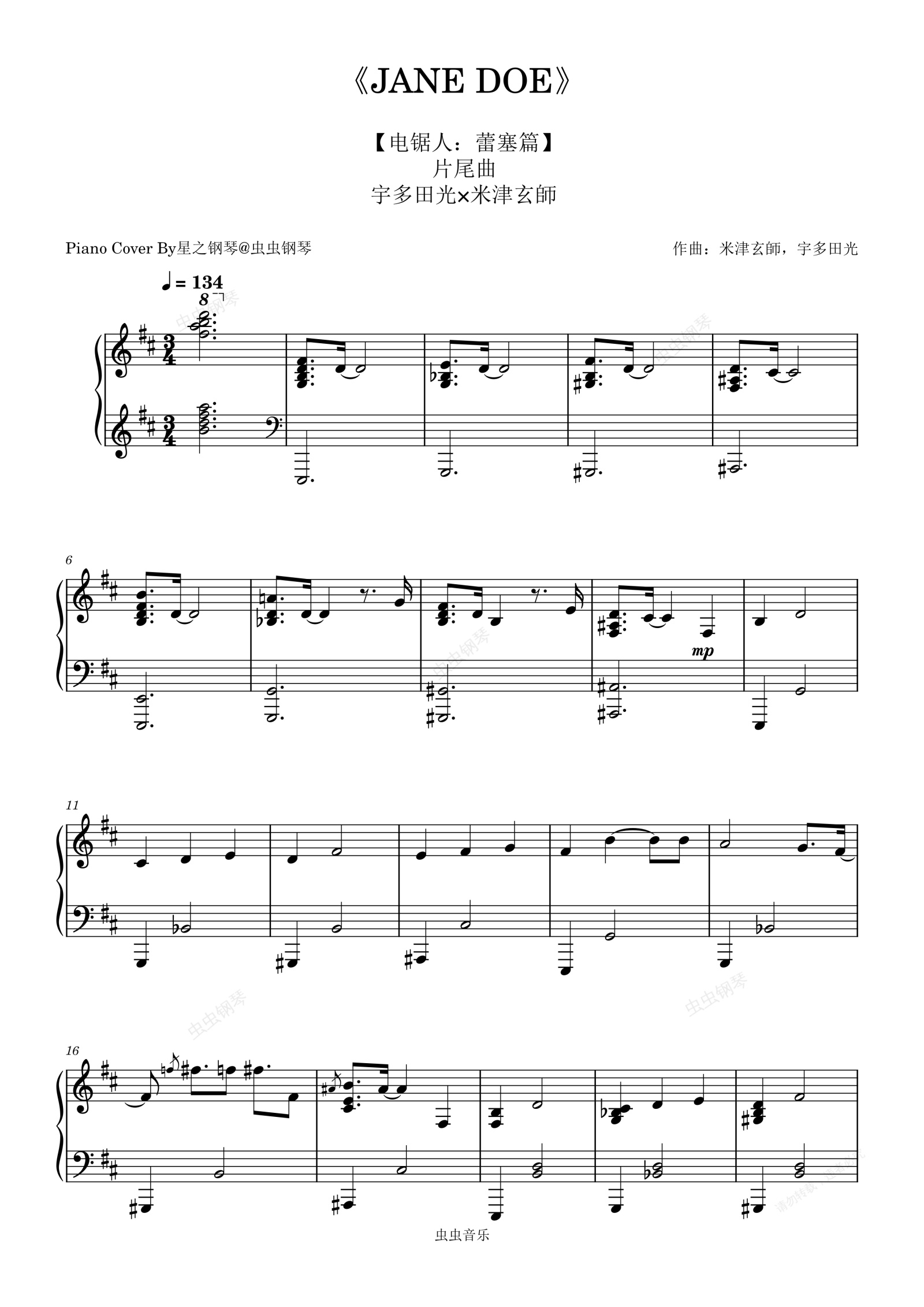 钢琴谱:【电锯人剧场板:蕾塞篇】片尾曲《JANE DOE》钢琴极限还原版~星之钢琴~