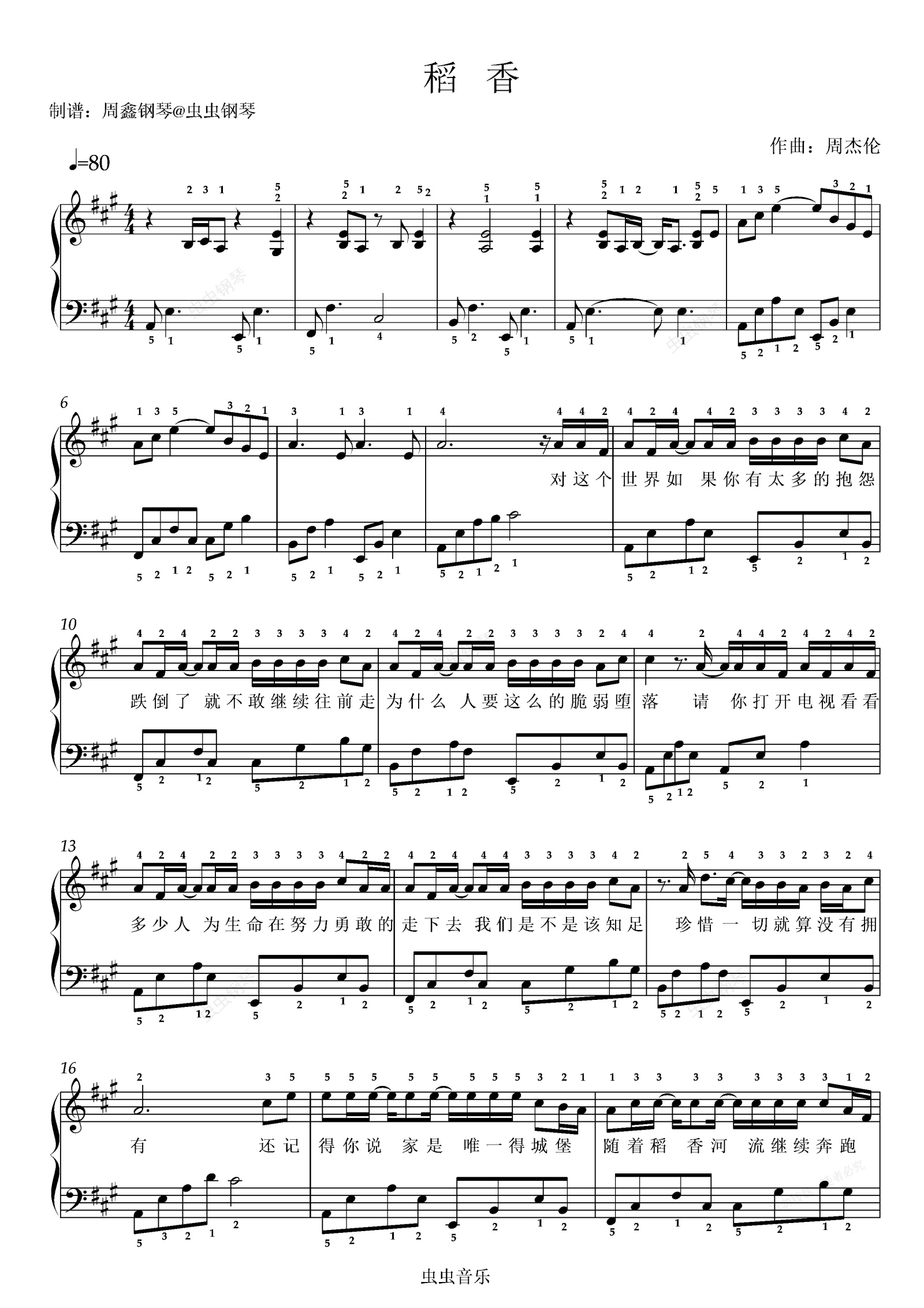 钢琴谱:《稻香》A大调 带歌词 带指法 简单版