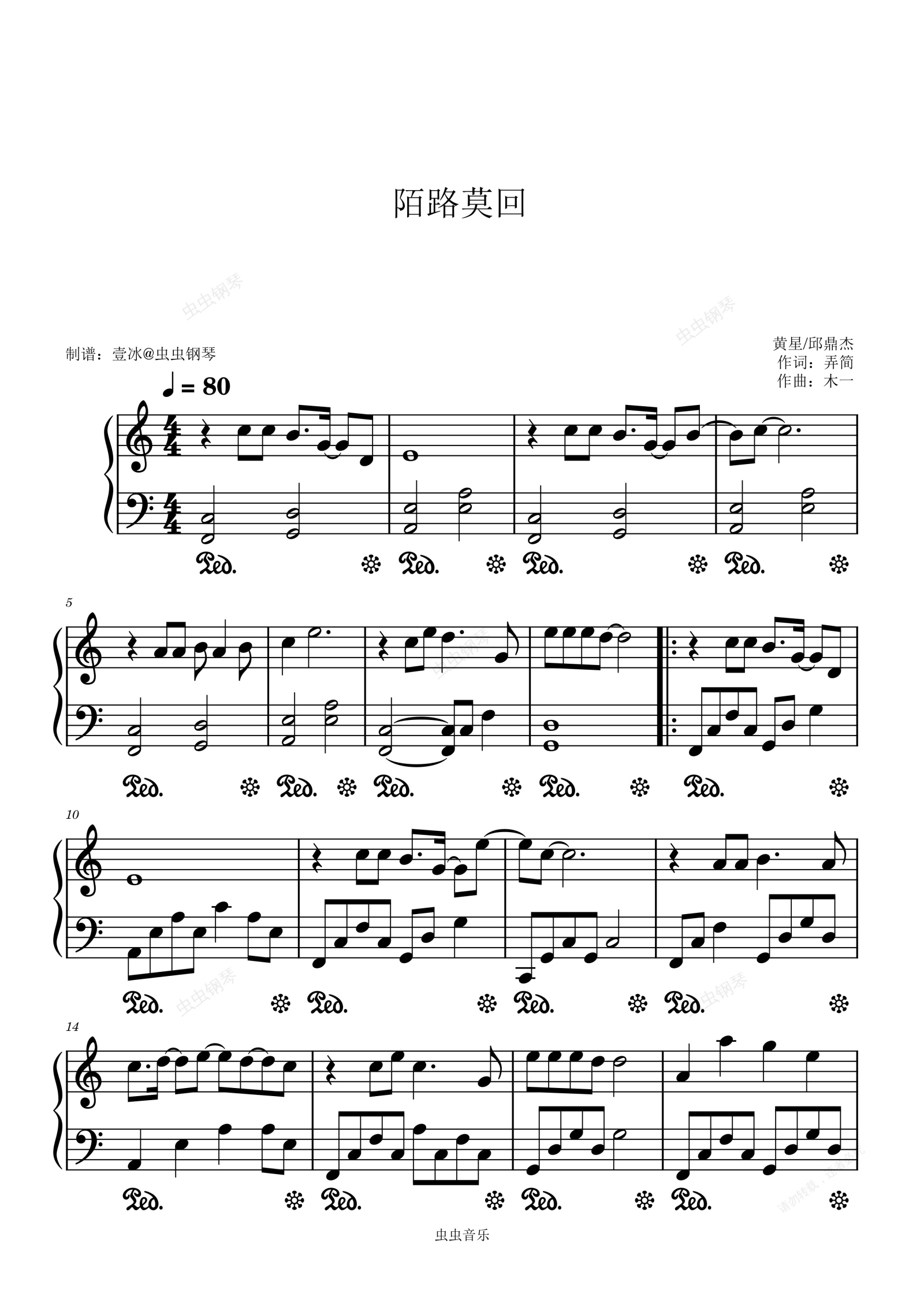 钢琴谱:陌路莫回-黄星/邱鼎杰 C调