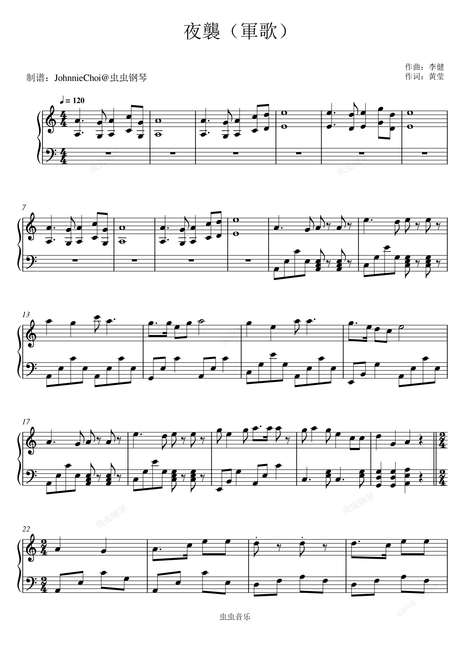 钢琴谱:夜袭(军歌)-李健-完整版