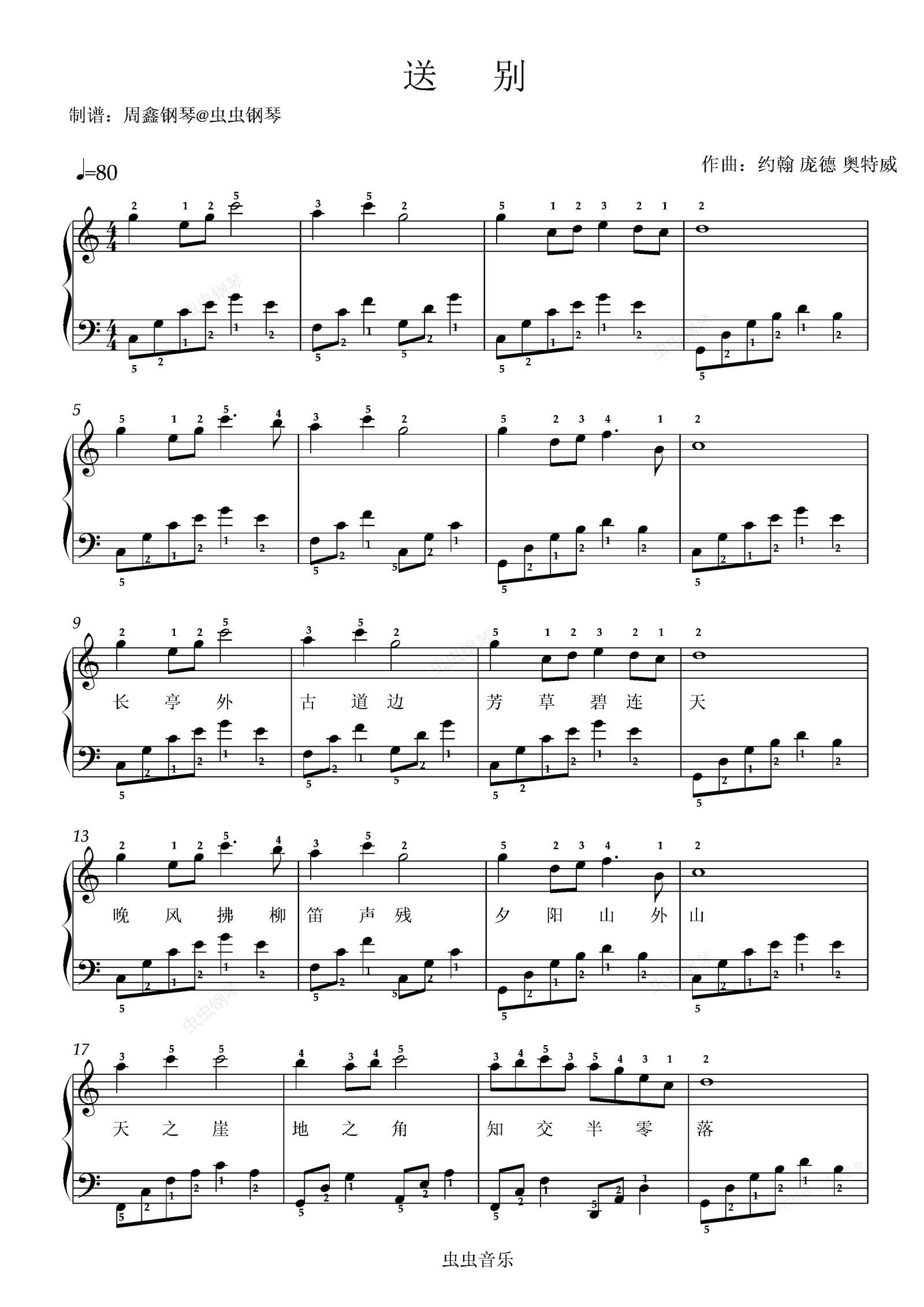 钢琴谱:《送别》C大调 带指法 带歌词 简单版