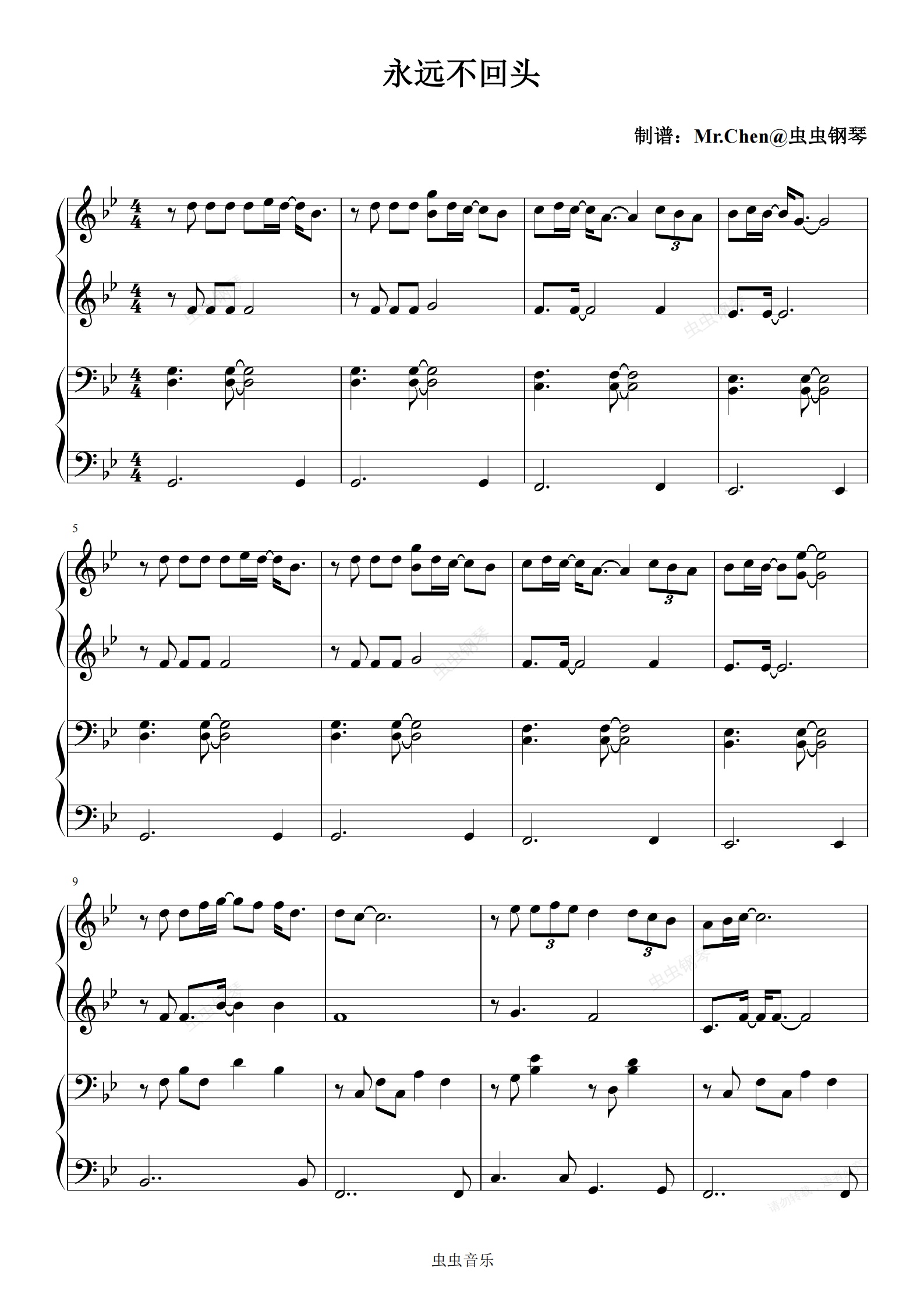 钢琴谱:永远不回头 (四手联弹)- 电影《飞驰人生3》插曲