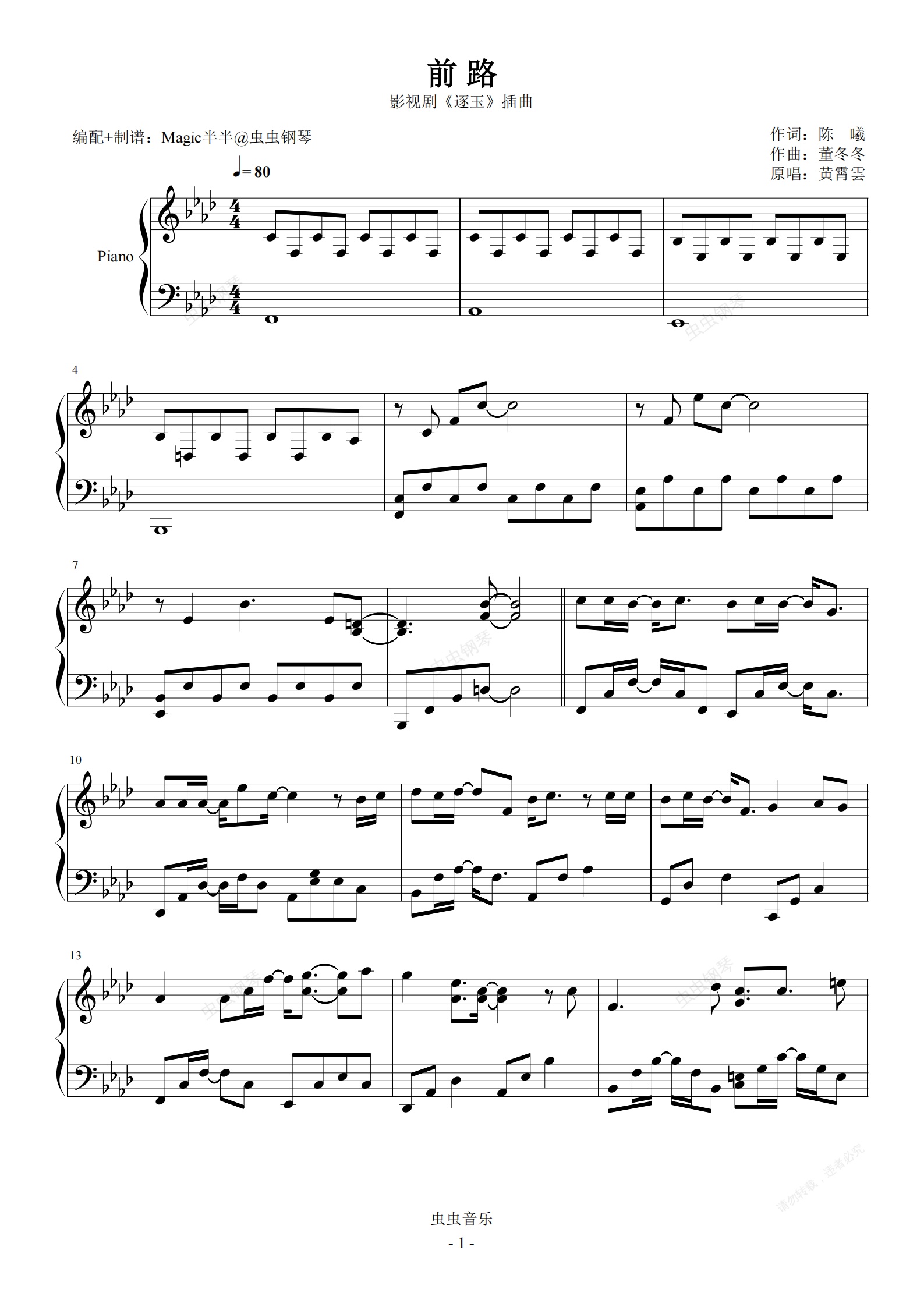 钢琴谱:前路(实用精华版/降A) <逐玉>影视剧插曲