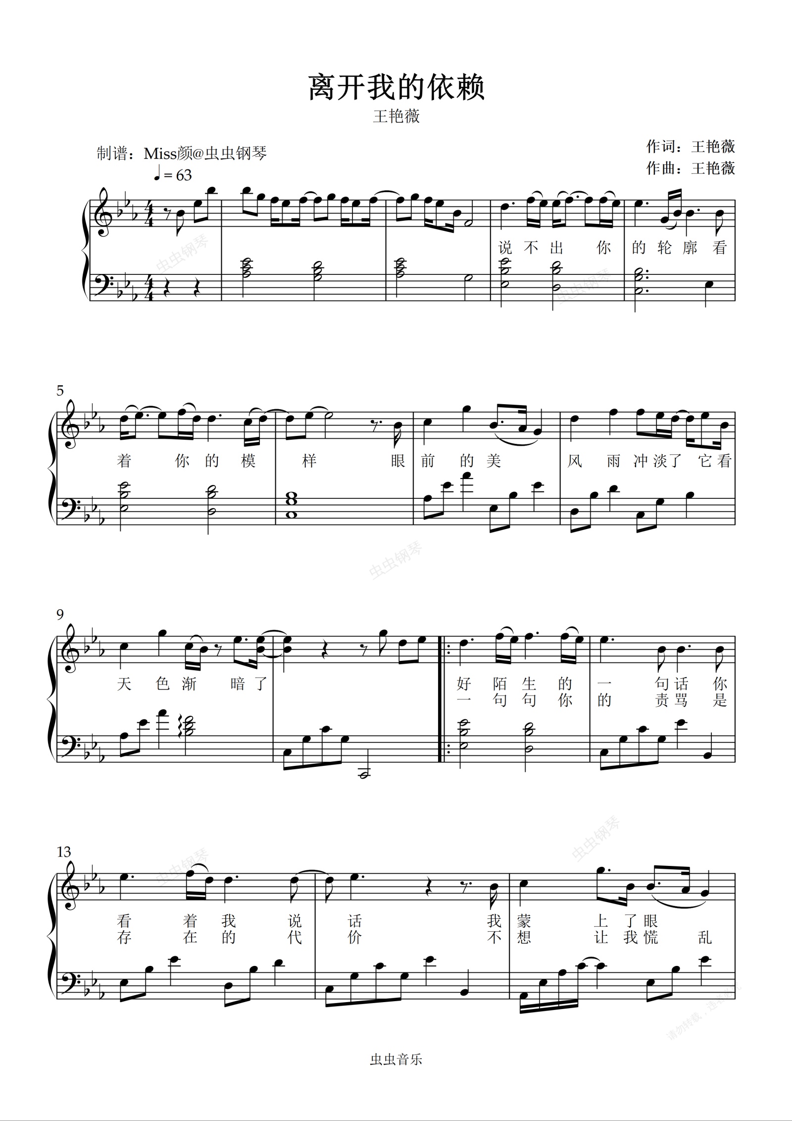 钢琴谱:离开我的依赖 王艳薇 降E转E