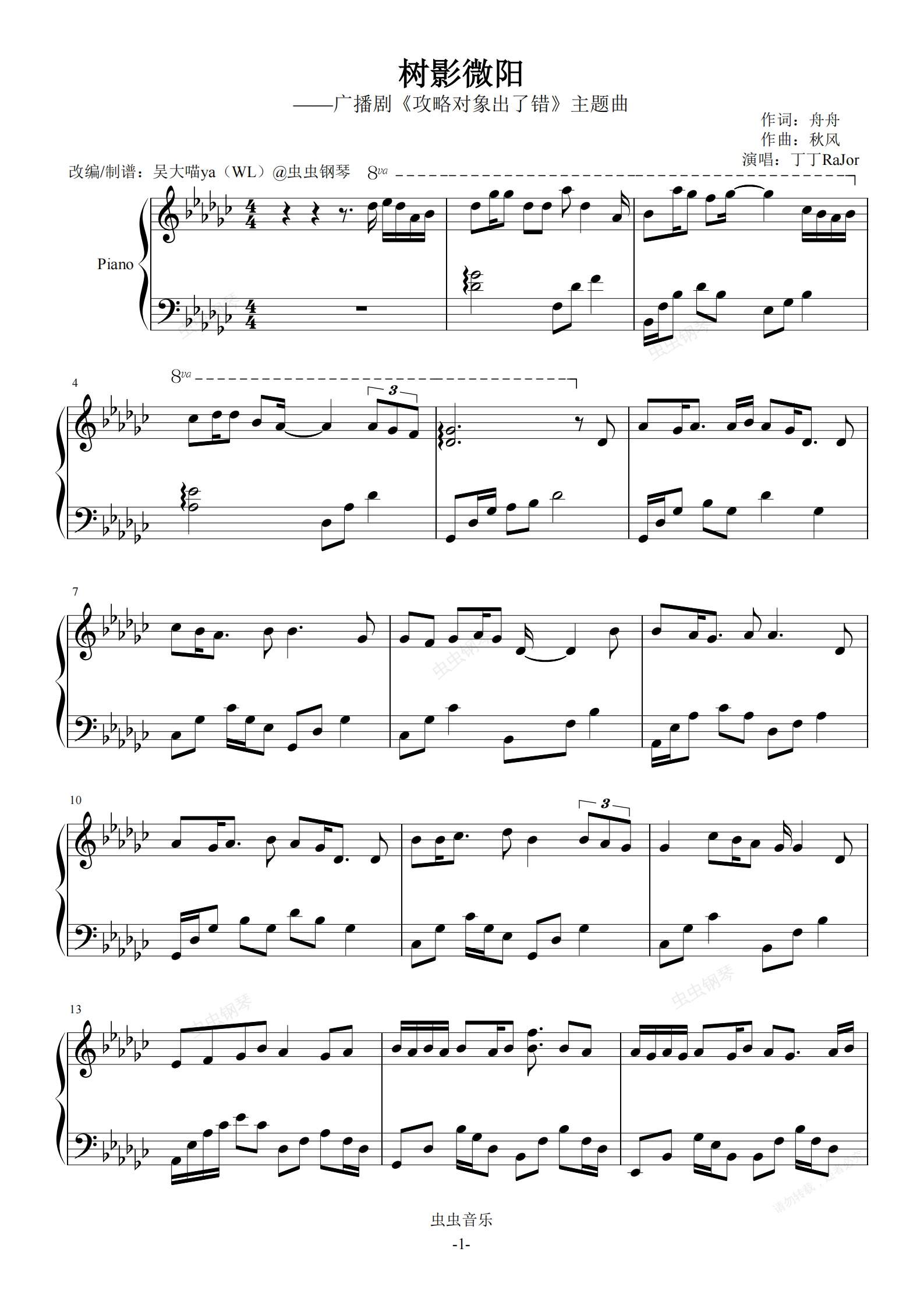 钢琴谱:树影微阳-广播剧《攻略对象出了错》主题曲 原调