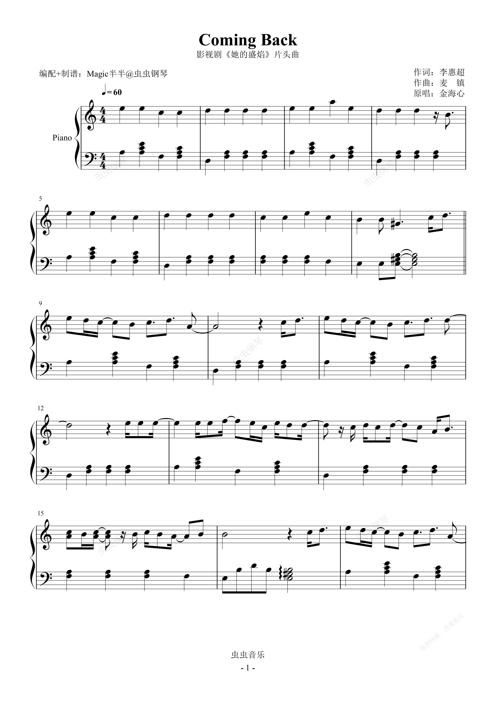 钢琴谱:Coming Back(实用精华版/C调) <她的盛焰>影视剧片头曲