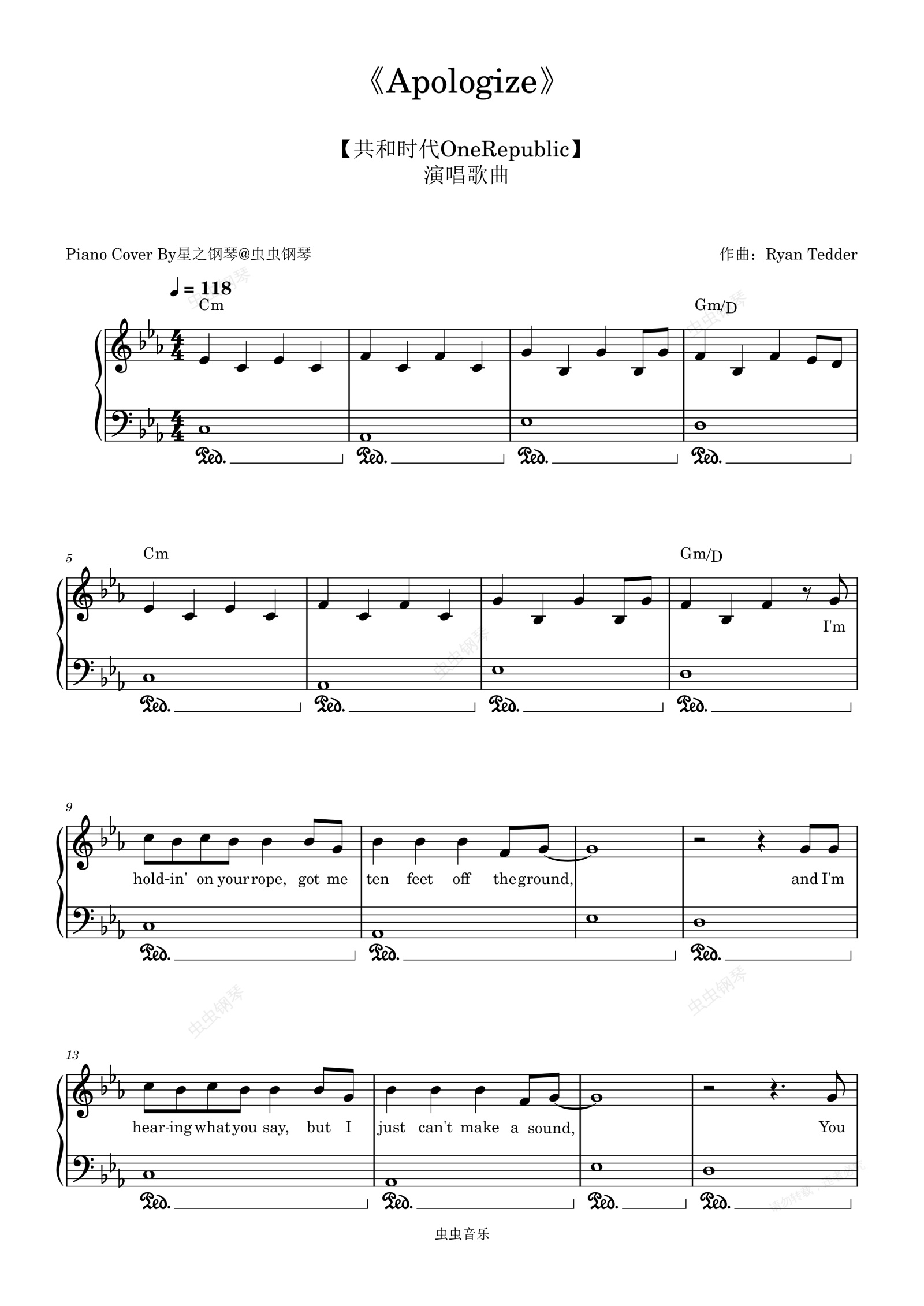 钢琴谱:【共和时代OneRepublic】带歌词《Apologize》简单钢琴谱~星之钢琴~
