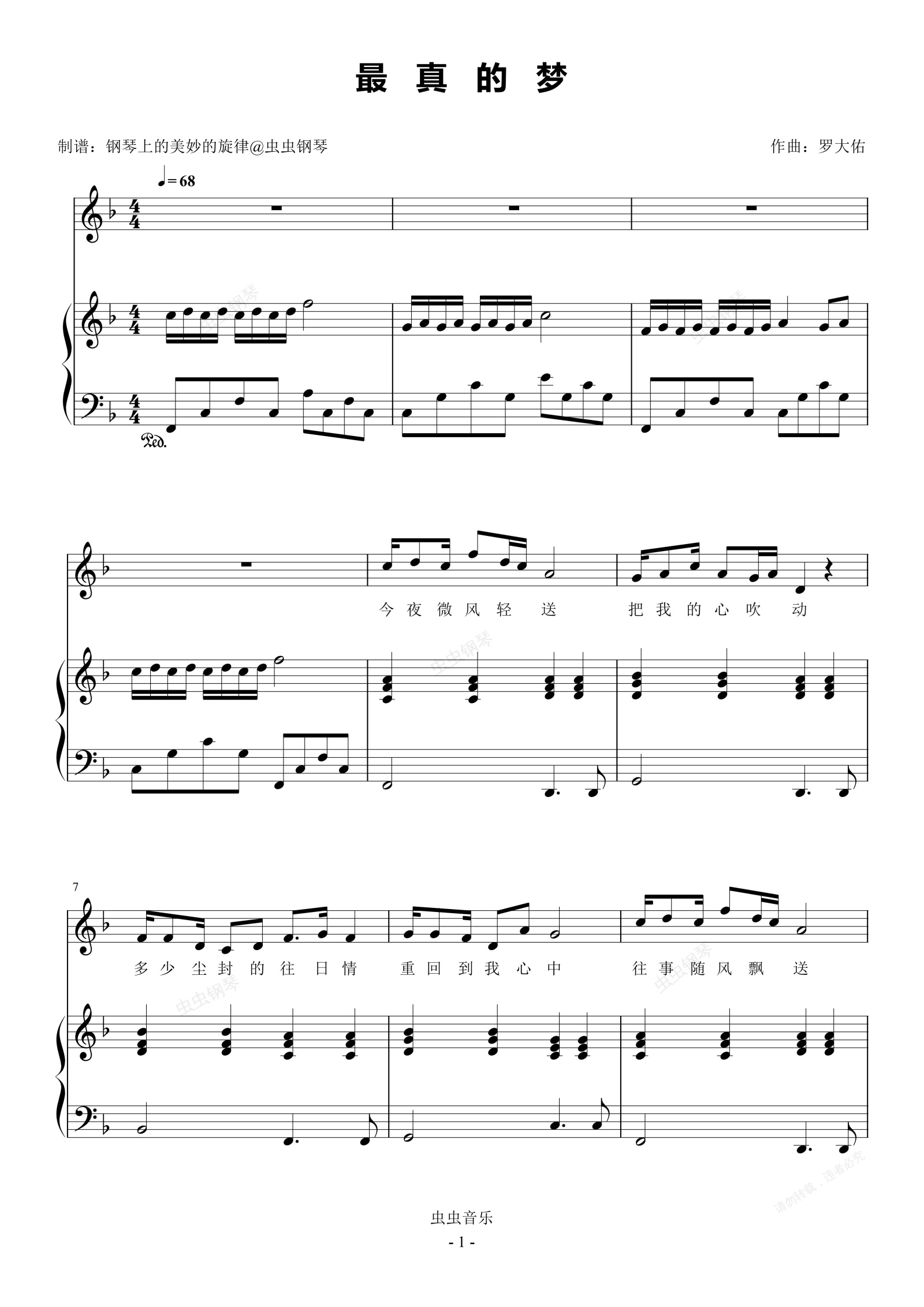 钢琴谱:最真的梦 简易钢琴弹唱伴奏 带歌词 大头针/周华健 抖音流行歌曲