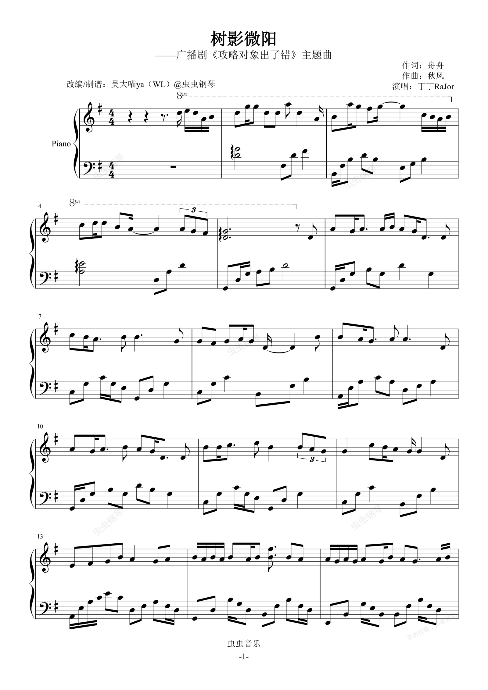 钢琴谱:树影微阳G调-广播剧《攻略对象出了错》主题曲