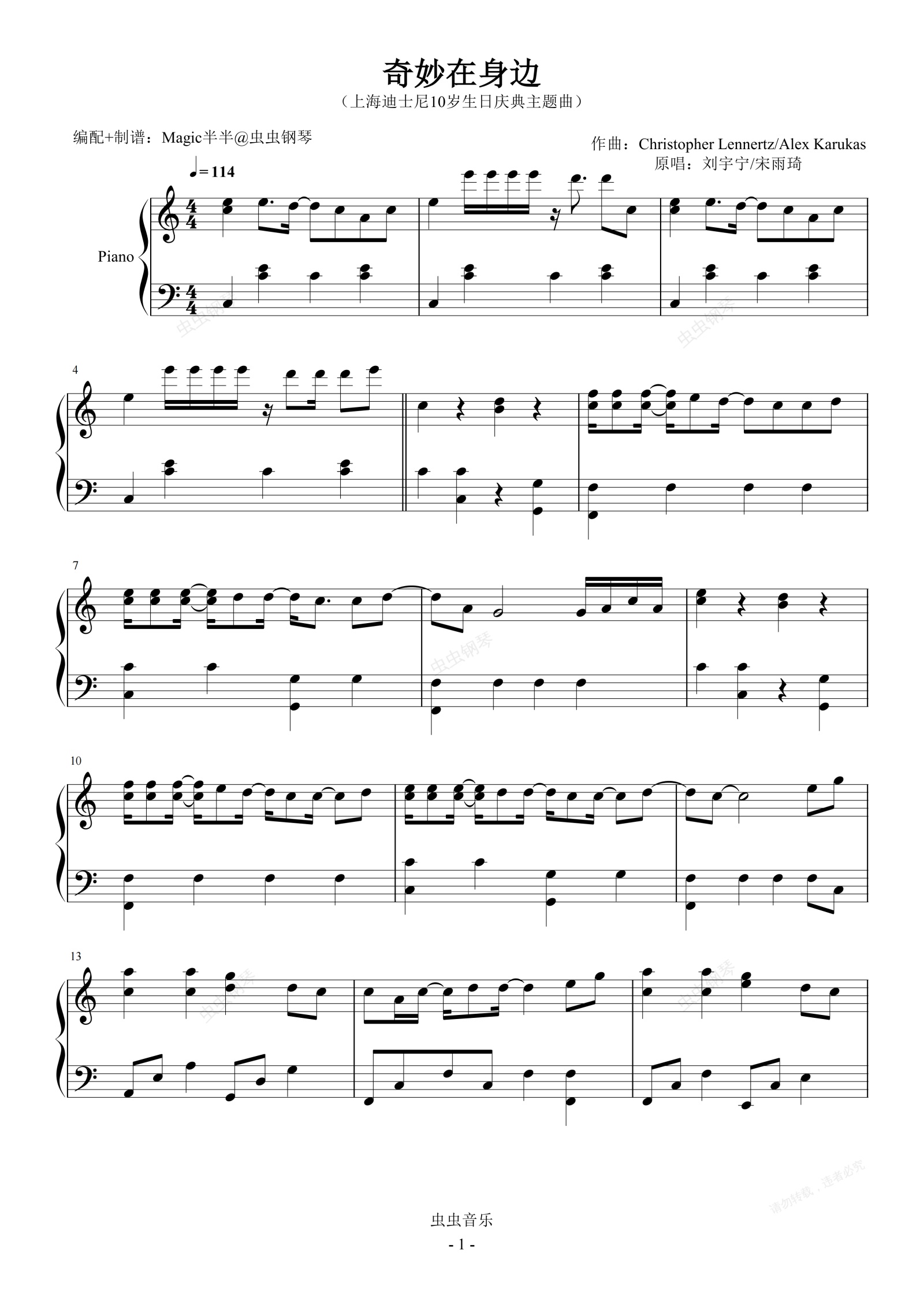 钢琴谱:奇妙在身边(实用/完整版/C) 上海迪士尼10岁生日庆典主题曲
