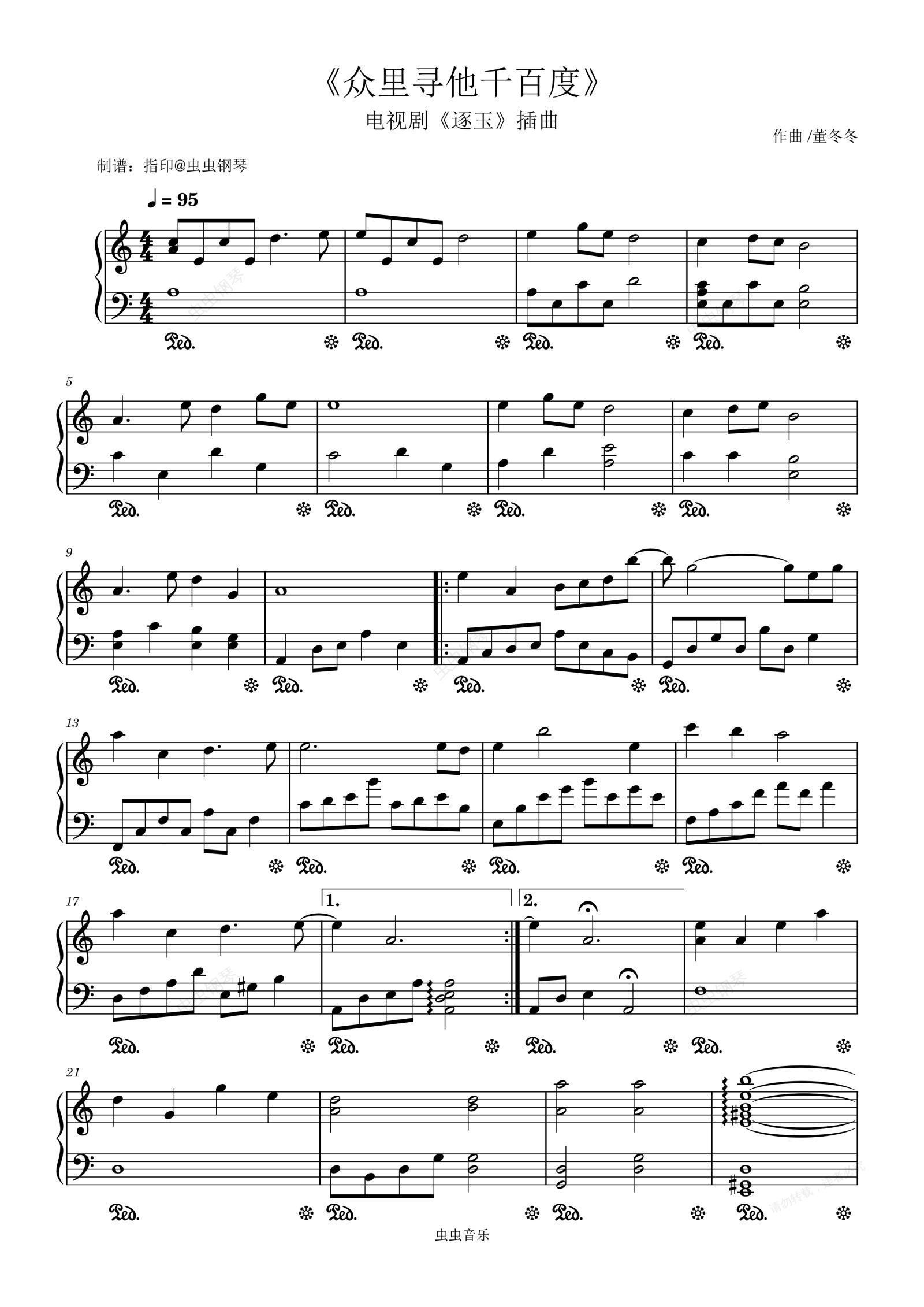 钢琴谱:《众里寻他千百度》电视剧《逐玉》(爱情主题曲)