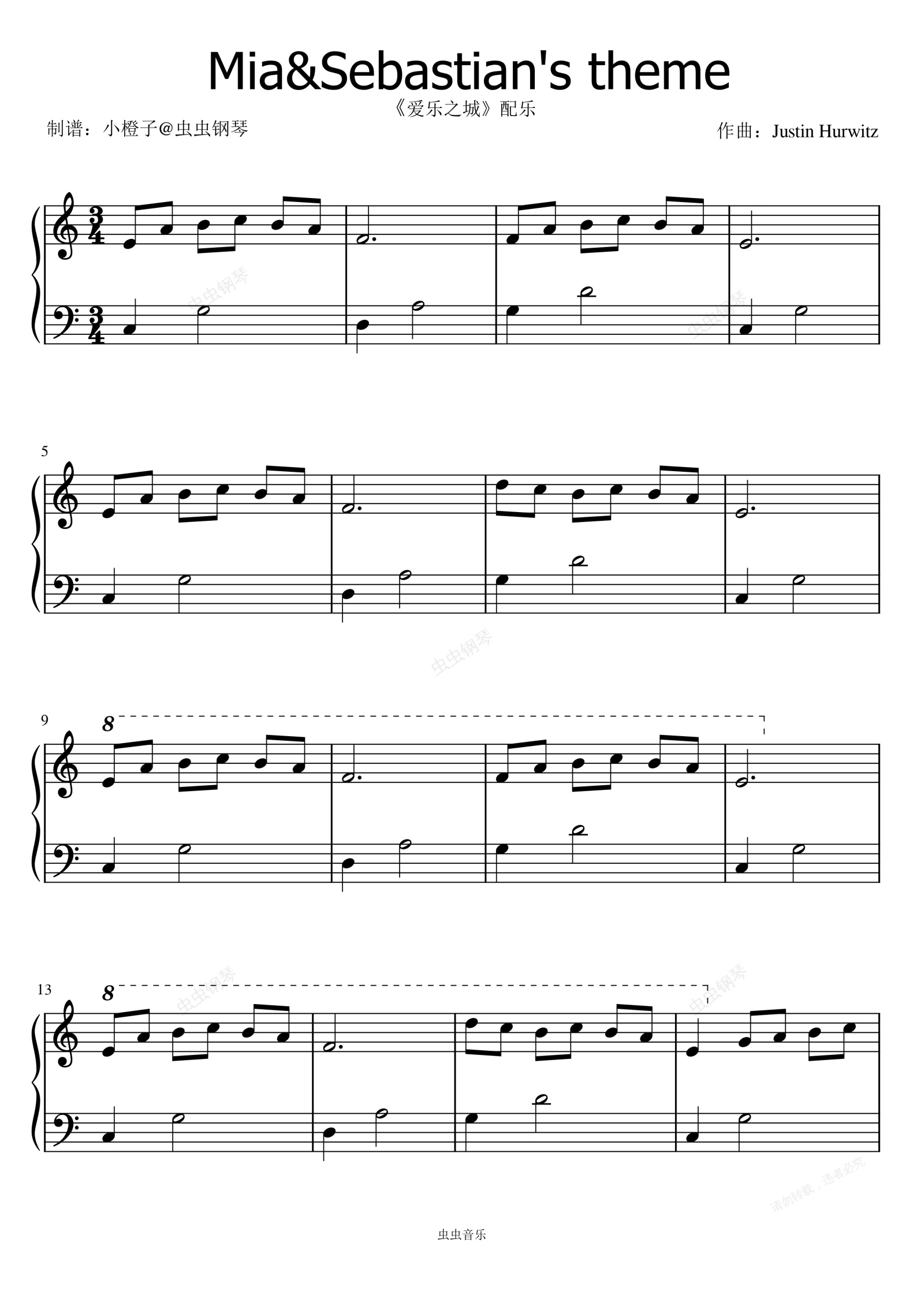 钢琴谱:超简单C调《爱乐之城》插曲+小汤难度