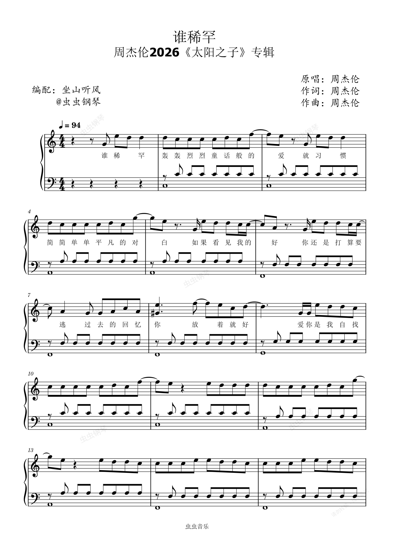 钢琴谱:谁稀罕——周杰伦2026《太阳之子》专辑【带歌词】