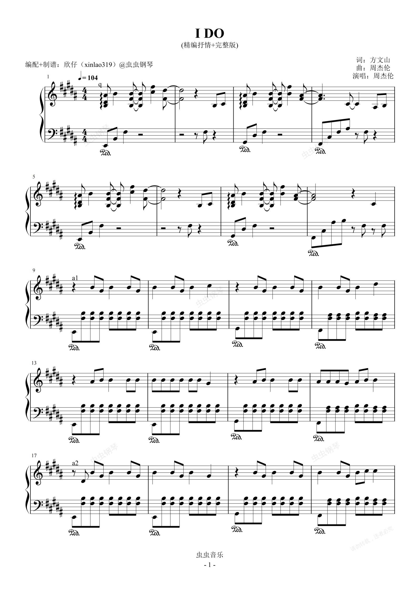 钢琴谱:I DO(原调B、周杰伦、精编抒情+完整版)