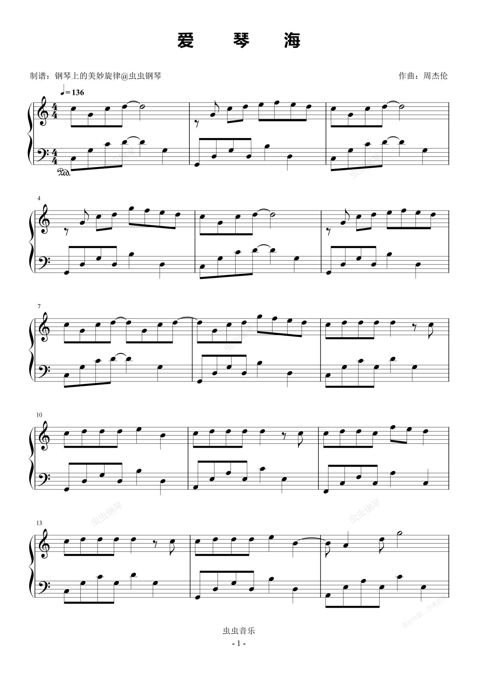 钢琴谱:爱琴海 C调简易版 周杰伦