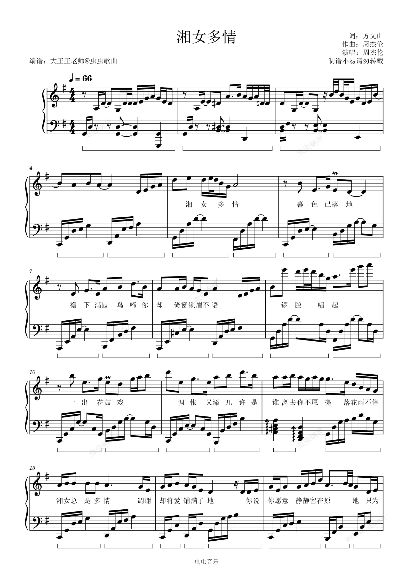 钢琴谱:湘女多情(带歌词周杰伦)