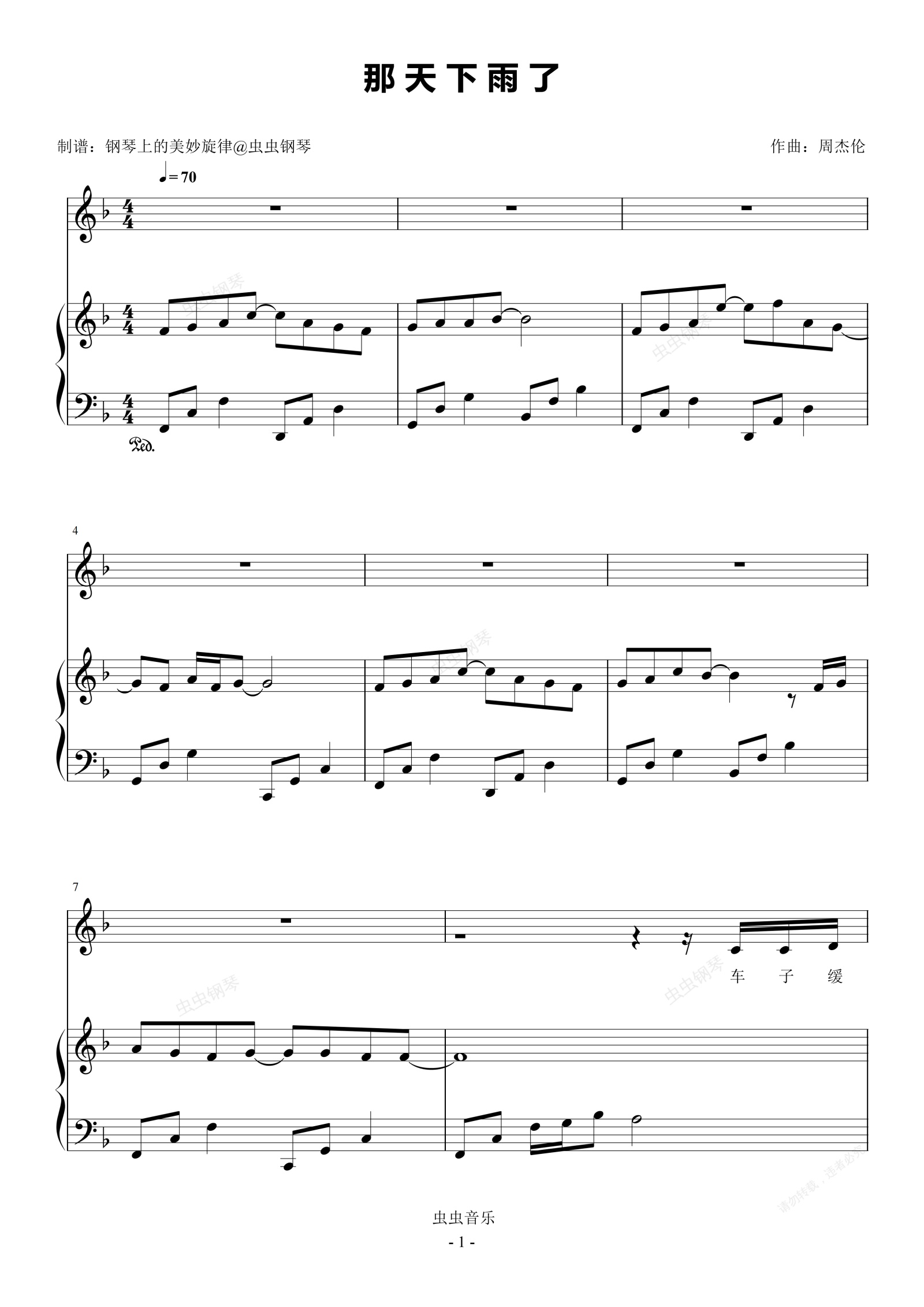 钢琴谱:那天下雨了 原调简易钢琴弹唱伴奏 带歌词 周杰伦