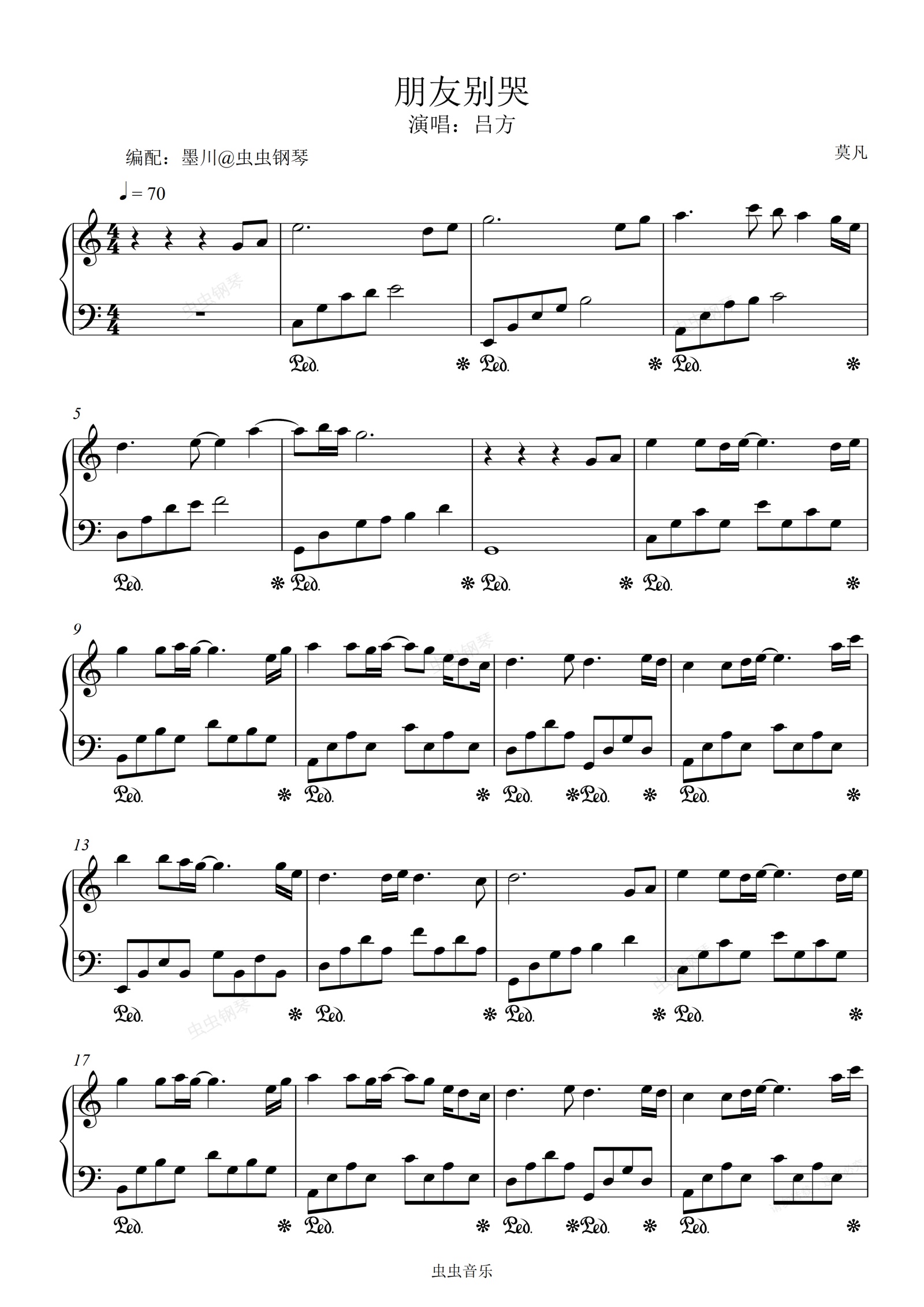 钢琴谱:朋友别哭—吕方—C调简易编配