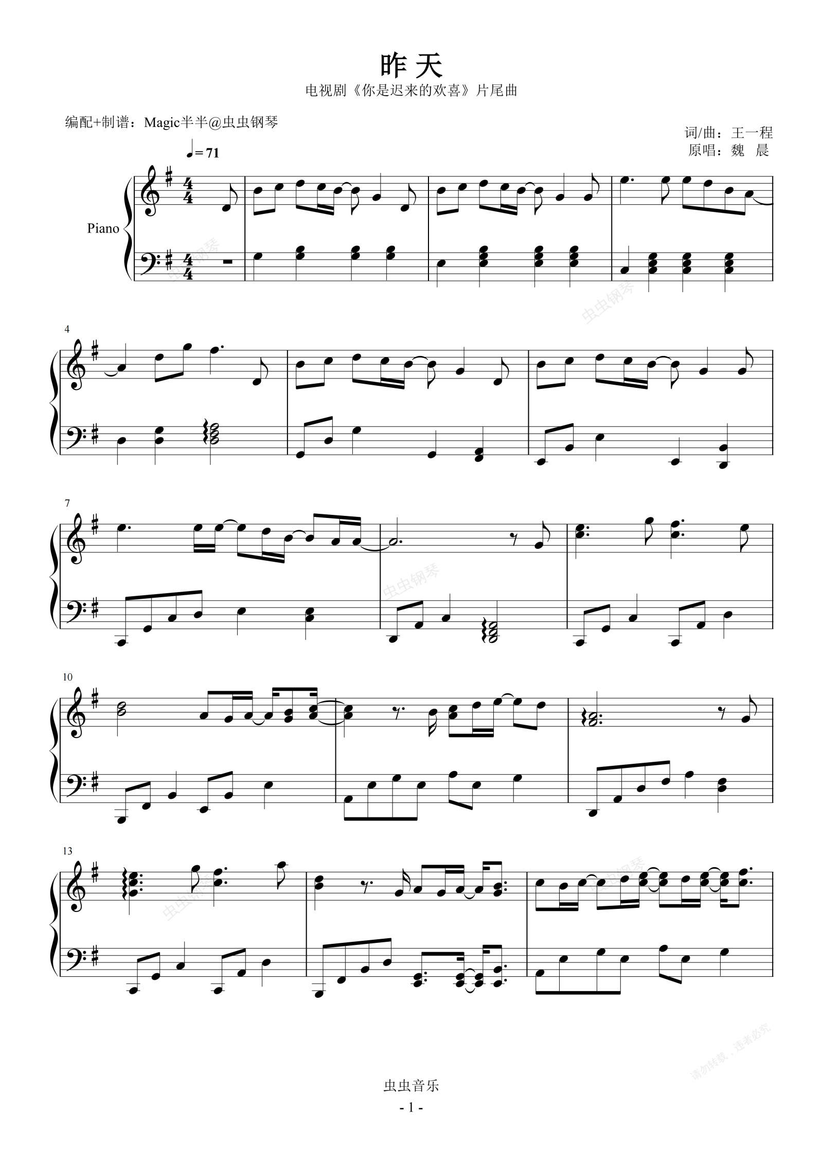 钢琴谱:昨天(实用精华版/G调) <你是迟来的欢喜>电视剧片尾曲